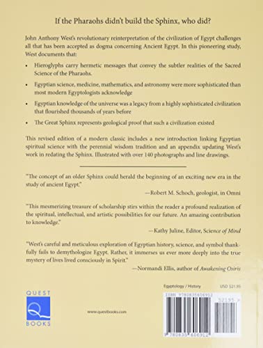 John Anthony West’s revolutionary reinterpretation of the civilization of Egypt challenges all that has been accepted as dogma concerning Ancient Egypt. In this pioneering study West documents that: Hieroglyphs carry hermetic messages that convey the subtler realities of the Sacred Science of the Pharaohs. Egyptian science, medicine, mathematics, and astronomy were more sophisticated than most modern Egyptologists acknowledge. Egyptian knowledge of the universe was a legacy from a highly sophisticated civilization that flourished thousands of years ago. The great Sphinx represents geological proof that such a civilization existed. This revised edition includes a new introduction linking Egyptian spiritual science with the perennial wisdom tradition and an appendix updating West’s work in redating the Sphinx. Illustrated with over 140 photographs and line drawings.