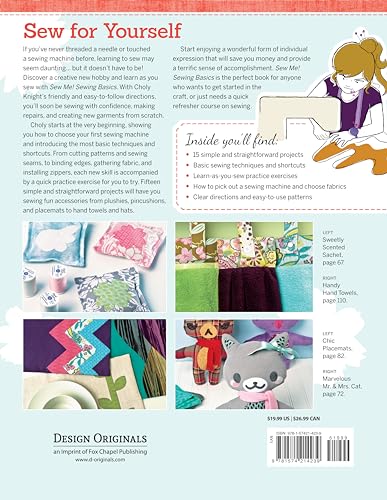 Discover a creative new hobby and learn as you sew with Sew Me! Sewing Basics: 15 simple, straightforward projects Friendly, easy-to-follow directions will help you sew with confidence, make repairs, and create new garments from scratch Master essential sewing skills from cutting patterns & sewing seams to binding edges, gathering fabric, and installing zippers Learn as you sew with each new skill presented alongside a quick practice exercise to try Create fun accessories from plushies and pincushions to placemats, hats, scarves, & more If you’ve never threaded a needle or touched a sewing machine before, learning to sew may seem daunting… but it doesn’t have to be! With Choly Knight’s friendly and easy-to-follow directions, you’ll soon be sewing with confidence, making repairs, and creating new garments from scratch. Sew Me! Sewing Basics is the perfect book for anyone who wants get started in the craft, or just needs a quick refresher course on sewing. Choly starts at the very beginning, showing you how to choose your first sewing machine and introducing the most basic techniques and shortcuts. From cutting patterns and sewing seams to binding edges, gathering fabric and installing zippers, each new skill is accompanied by a quick practice exercise to try, allowing you to learn as you sew. 15 simple and straightforward projects are provided for sewing fun accessories from plushies and pincushions to placemats, hand towels, hats and more. Start enjoying a wonderful form of individual expression that will save you money and provide a terrific sense of accomplishment!