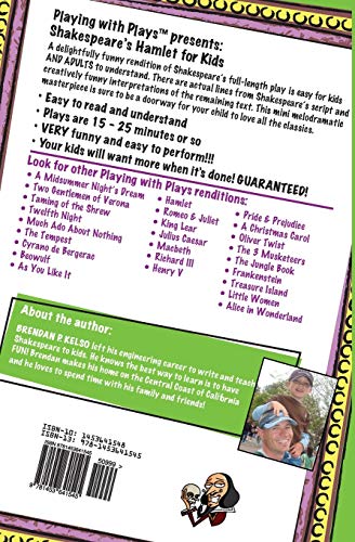 Who will you be? Hamlet? Claudius? Ophelia? Rosencrantz or Guildenstern?! Hamlet like you have never experienced it before: quick, fun, and easy to understand. Designed for 6-20+ actors, kids, families, or anyone who wants to enjoy and perform Shakespeare’s classic play. Hamlet for Kids is a play versatile enough for sibling fun, classes, drama groups, homeschool groups, or backyard performances. It’s appropriate and fun for all ages! Plays range from 15 to 25 minutes. Which character will your kids be?! What you will get: Fun! 3 hilarious modifications for group sizes: 6-7+ 8-14+ 11-20+ Actual lines from Shakespeare’s play highlighted for easy identification Creatively funny and witty telling of the remaining script A delightfully funny rendition that is easy for ADULTS to understand too! A kid who loves Shakespeare! This mini-melodramatic masterpiece is sure to spark a love of Shakespeare. Shakespeare is difficult enough in class or watching onstage, let alone trying to teach the stories to children, but as the author’s mantra states in the book, “there is no better way to learn than to have fun! “Kids who have read this have also eventually purchased the entire Shakespeare works, and have completed ‘hero’ reports on Shakespeare at school. Guaranteed to have you coming back for more!