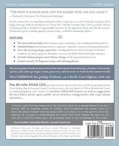 “The Earth is a book and, with the proper tools, we can read it.” –Thomas E. Cochrane, CA Professional Geologist “His book is a compendium of research into one of the most geologically diverse regions in the state, and any lover of geology, nature or adventure will have a wonderful time reading through its pages.” –Northbay Biz Magazine (regional Business Journal serving Sonoma, Marin & Napa counties) For the curious, here’s a compelling examination of the complex processes involved inside our planet which began eons ago. With an introduction to Deep Time and the Geologic Time Clock, geologist Thomas Cochrane provides a detailed yet approachable overview for the layperson of how and why the Sonoma-Mendocino region’s coastline appears as it does today–with all its fascinating oddities. EXPLORE: * The San Andreas Fault and its dynamic–plus continuing–role in shifting both land and sea * Unusual features including sink holes, sag ponds, submarine canyons & underground streams * Meet the area’s geologic superstars: Bowling Ball Beach, Devil’s Punchbowl, Witches Cauldron, sea stacks, gargoyles, blowholes, sea caves, the 8000 Black Point Spilite and more * Includes human impact and climate change on the regional land and ocean environment * Features nearly 50 diagrams, maps, and striking photos The ideal primer for those interested in the often mysterious interplay of water, wind, earthquakes,and other geologic events, processes, and stressors at work in the natural world. Then EXPERIENCE this geology firsthand…on a Pacific Coast Highway road trip! The 85-mile ROAD LOG provides precise instructions for a self-drive geological tour up Highway 1 from Bodega Bay at Sonoma County’s southern tip to the tiny hamlet of Elk in Mendocino County (utilizing highway mile markers) includes MUST-SEE features as well as suggestions for best hikes, picnic spots, public access beaches, campgrounds, side trips inland, and more… “Sonoma Land Trust has long known the Sonoma Coast as a special place to be protected. With his expertise, sense of curiosity, and investigation, the author came to know this place in-depth and has shared with us its story. It is a true gem to have this resource as a guide to understanding the forces that have shaped the land as we now see it. And the Road Log is an invaluable asset to our knowledge of the coast.” –Dave Koehler, Executive Director, Sonoma Land Trust NOTE: with over four dozen maps, diagrams, and photos, this material isn’t suitable for an ebook so it’s only available in this paperback format. While most geologic Road Logs only have a dozen or fewer stops, Shaping the Sonoma-Mendocino Coast has a whopping 150!