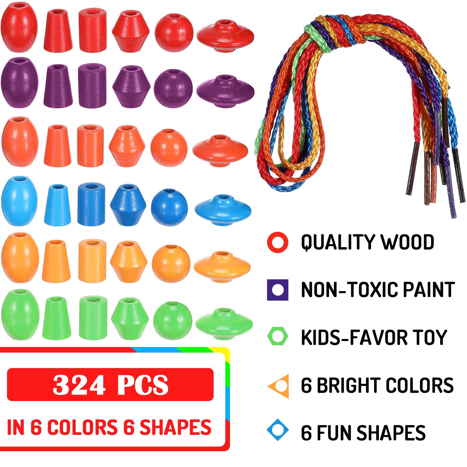 - 324 Pieces Lacing Beads: you will receive 324 pcs lacing beads toy, approximately 1 inch in diameter, with a 3/8 inch lacing hole, which is in 6 colors and 6 shapes: oblate, prism shape, cylindrical, spherical, etc., you will have fun while playing with these colorful lacing beads