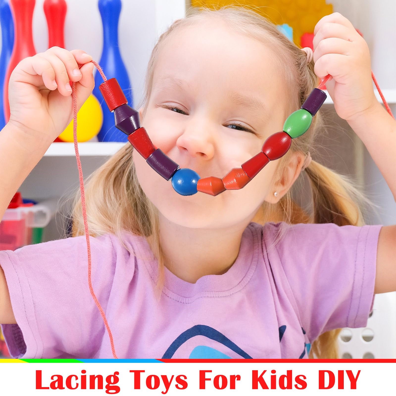- 6 Bright Colors Wooden Beads: the toddler string beads set is composed of 6 brightly colored wooden beads, which can help your kids develop hand-eye coordination, fine motor skills, color and shape recognition, sequencing and counting skills when playing