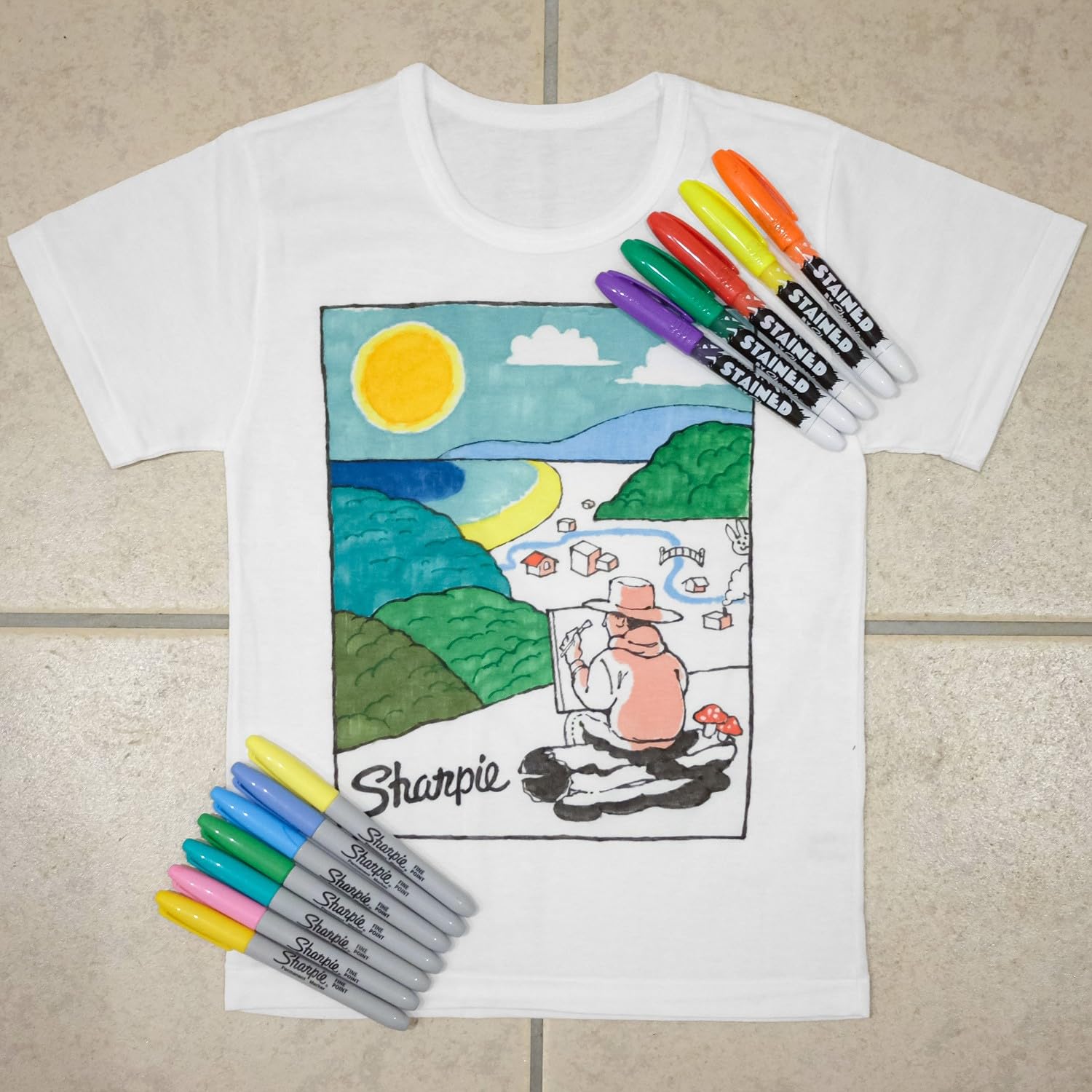 Design one-of-a-kind clothing, backpacks, shoes and more with Sharpie Stained Fabric Markers. Loaded with eight colors of vivid ink that’s designed to resist fading even after washes, they’re perfect for making truly original creations like adding hand lettering and calligraphy to your gear. The brush tip draws both thick and thin lines to produce beautiful stained images on a variety of fabric surfaces. Start a line of your own design with Sharpie Stained markers!