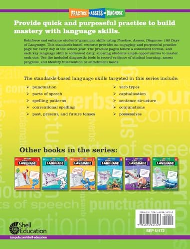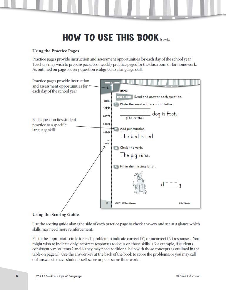 180 Days of Language is a fun and effective daily practice workbook designed to help students improve their grammar skills. This easy-to-use kindergarten workbook is great for at-home learning or in the classroom. The engaging standards-based activities cover grade-level skills with easy to follow instructions and an answer key to quickly assess student understanding. Students will practice punctuation, capitalization, and spelling with daily activity pages. Watch as students improve their grammar and writing skills with these quick learning activities.Parents appreciate the teacher-approved activity books that keep their child engaged and learning. Great for homeschooling, to reinforce learning at school, or prevent learning loss over summer.Teachers rely on the daily practice workbooks to save them valuable time. The ready to implement activities are perfect for daily morning review or homework. The activities can also be used for intervention skill building to address learning gaps.