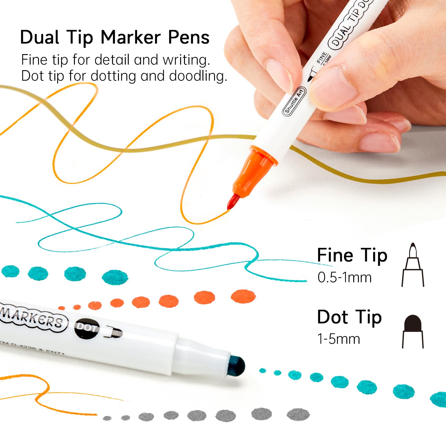 - DUAL TIP MORE COMBINATIONS: The 0.8mm fine tip of classic colors and 1mm fine tip of metallic colors are perfect for writing, marking and detail drawing .The round tip is not only for dots but also for lines and shapes. Apply different pressure on the tips you will get different sizes of dots and shapes which has so many combinations to offer