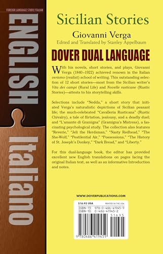 With his novels, short stories, and plays, Giovanni Verga (1840-1922) achieved renown in the Italian verismo (realist) school of writing. This outstanding selection of 12 short stories — most from the Sicilian writer’s Vita dei campi (Rural Life) and Novelle rusticane (Rustic Stories) — attests to his storytelling skills. Selections include “Nedda,” a short story that initiated Verga’s naturalistic depictions of Sicilian peasant life; the much-celebrated “Cavalleria Rusticana” (Rustic Chivalry), a tale of flirtation, jealousy, and a deadly duel; and “L’amante di Gramigna” (Gramigna’s Mistress), a fascinating psychological study. The collection also features “Reverie,” “Jeli the Herdsman,” “Nasty Redhead,” “The She-Wolf,” “Pestilential Air,” “Possessions,” “The History of St. Joseph’s Donkey,” “Dark Bread,” and “Liberty.” For this dual-language book, the editor has provided excellent new English translations on pages facing the original Italian text, as well as an informative Introduction and notes.