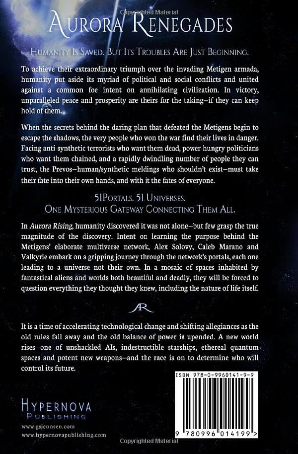 Humanity is saved. But its troubles are just beginning. To achieve their extraordinary triumph over the invading Metigen armada, humanity put aside its myriad of political and social conflicts and united against a common foe intent on annihilating civilization. In victory, unparalleled peace and prosperity are theirs for the taking–if they can keep hold of them. When the secrets behind the daring plan that defeated the Metigens begin to escape the shadows, the very people who won the war find their lives in danger. Facing anti-synthetic terrorists who want them dead, power-hungry politicians who want them chained, and a rapidly dwindling number of people they can trust, the Prevos–human/synthetic meldings who shouldn’t exist–must take their fate into their own hands, and with it the fates of everyone. 51 Portals. 51 Universes. One mysterious gateway connecting them all. In Aurora Rising, humanity discovered it was not alone–but few grasp the true magnitude of the discovery. Intent on learning the purpose behind the Metigens’ elaborate multiverse network, Alex Solovy, Caleb Marano and Valkyrie embark on a gripping journey through the network’s portals, each one leading to a universe not their own. In a mosaic of spaces inhabited by fantastical aliens and worlds both beautiful and deadly, they will be forced to question everything they thought they knew, including the nature of life itself. * It is a time of accelerating technological change and shifting allegiances as the old rules fall away and the old balance of power is upended. A new world rises–one of unshackled AIs, indestructible starships, ethereal quantum spaces and potent new weapons–and the race is on to determine who will control its future.