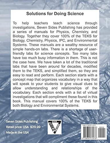 To help teachers teach science through investigations, Seven Sides Publishing has provided a series of manuals for Elementary Science, Middle School Science, Physics, Chemistry, Biology, Earth & Space Science, and Environmental Systems. They all cover 100% of the TEKS and National Standards for their respective classes. Even IPC has 100% of its standards covered in the Physics and Chemistry manuals. These manuals are a rich resource of simple hands-on labs. Each manual has at least 100 investigations in them. There is a shortage of user-friendly labs for science classes to use. Too many labs have too much busy information; this is not the case here. We have taken a lot of the traditional labs that have been around for decades, modified them to the TEKS, and simplified them, so they are easy to read and perform. Each section starts with a concept map that organizes vocabulary that speaks to your students giving visual clues to allow understanding and relationships of the vocabulary. Each section ends with a list of virtual investigations that complement those found in this book.