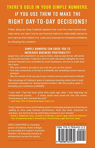 Simple Numbers can guide you to increased business profitability! Take the mystery out of small business finance with this no-frills guide to understanding the numbers that will guide your business out of any financial black hole. Author Greg Crabtree, a successful accountant, small business advisor, and popular presenter, shows you how to use your firm’s key financial indicators as a basis for smart business decisions as you grow your firm from startup to $5 million (and, more!) in annual revenue. Jargon free, and presented in an easy-to-follow, step-by-step format, with plenty of real-world examples, Crabtree’s down-to-earth discussion highlights the most common financial errors committed by small businesses, and how to avoid them. You’ll be fascinated to learn: *Why your numbers are lying to you (and why you are the cause!) *How labor productivity is the key to profitability and simplifying human resource decisions *Why the amount of tax you pay is your #1 key performance indicator Take advantage of Crabtree’s years of experience teaching clients how to build successful businesses by ”seeing beyond numbers” with this step-by-step guide to increasing your businesses profitability.