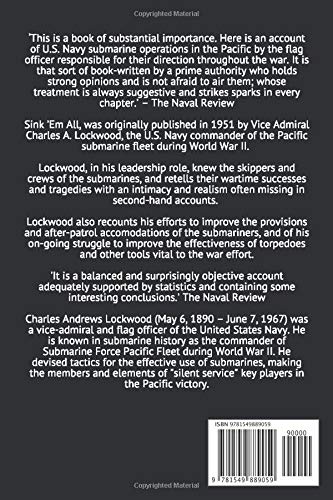‘This is a book of substantial importance. Here is an account of U.S. Navy submarine operations in the Pacific by the flag officer responsible for their direction throughout the war. It is that sort of book-written by a prime authority who holds strong opinions and is not afraid to air them; whose treatment is always suggestive and strikes sparks in every chapter.’ – The Naval Review Sink ‘Em All, was originally published in 1951 by Vice Admiral Charles A. Lockwood, the U.S. Navy commander of the Pacific submarine fleet during World War II. Lockwood, in his leadership role, knew the skippers and crews of the submarines, and retells their wartime successes and tragedies with an intimacy and realism often missing in second-hand accounts. Lockwood also recounts his efforts to improve the provisions and after-patrol accommodations of the submariners, and of his on-going struggle to improve the effectiveness of torpedoes and other tools vital to the war effort. ‘It is a balanced and surprisingly objective account adequately supported by statistics and containing some interesting conclusions.’ The Naval Review Charles Andrews Lockwood (May 6, 1890 – June 7, 1967) was a vice-admiral and flag officer of the United States Navy. He is known in submarine history as the commander of Submarine Force Pacific Fleet during World War II. He devised tactics for the effective use of submarines, making the members and elements of “silent service” key players in the Pacific victory.