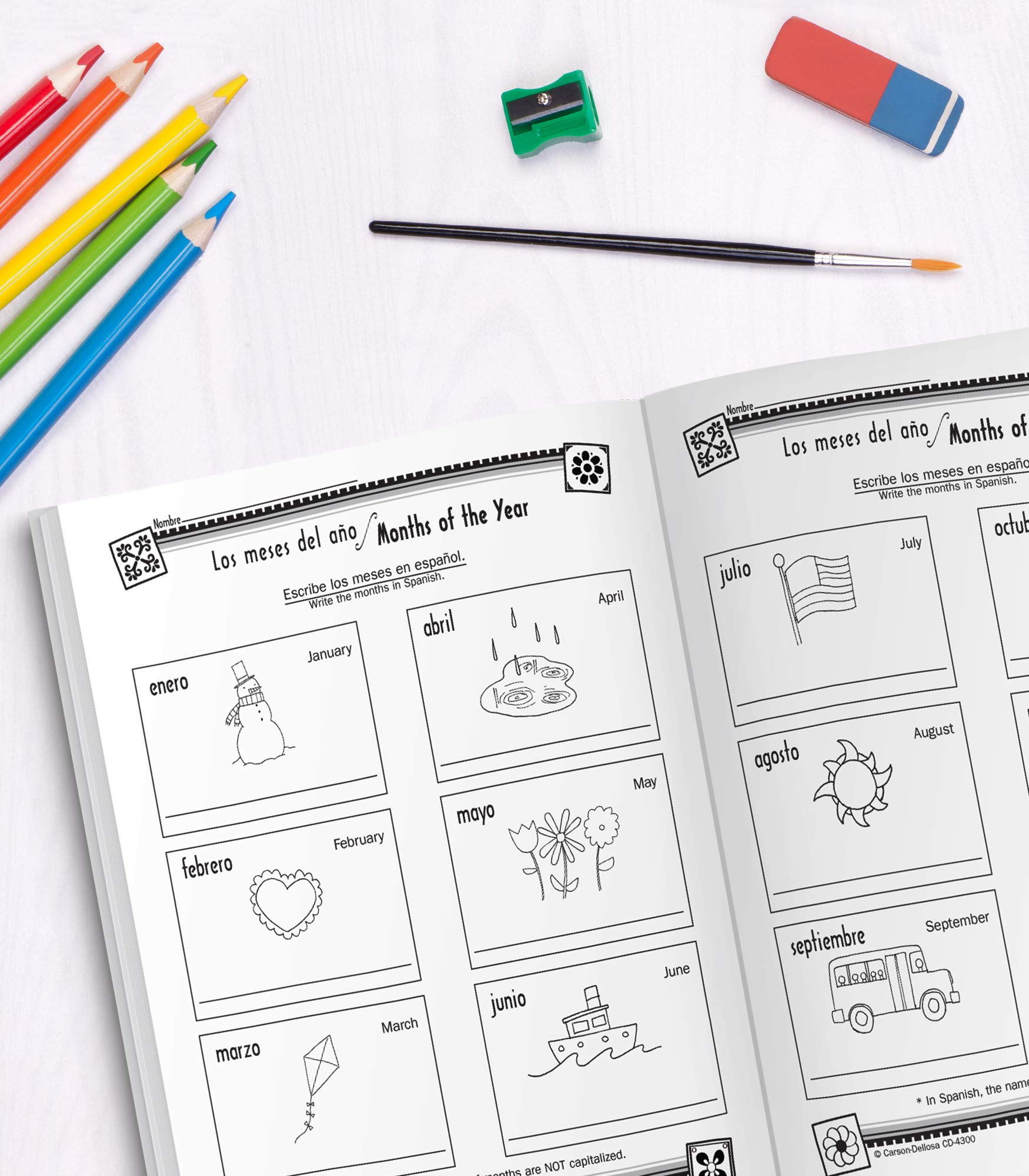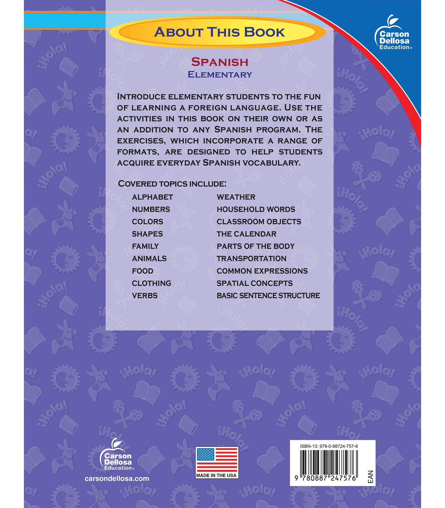 WORKBOOK FEATURES: * Ages 5-11, Grades K-5 * 128 pages, 10.8 inches x 8.2 inches * Topics covered: the alphabet, numbers, colors, shapes, family, home, calendar words, food, verbs, common expressions, basic sentence structure * Reproducible, cut-and-assemble mini review books * Includes an answer key FOCUSED PRACTICE: The Skills for Success Spanish elementary workbook for kindergarten through 5th grade helps your child build Spanish fluency through fun and engaging activities, covering topics such as the alphabet, numbers, colors, shapes, animals, clothing, verbs, weather, household words, classroom objects, days of the week, body parts, transportation, common expressions, spatial concepts, and basic sentence structure. CORRELATED TO CURRENT STATE STANDARDS: The activities in this illustrated workbook are designed to help students achieve world languages and cultures outcomes, including developing an understanding of everyday life within a target culture and speaking, writing, and reading basic words and phrases in a foreign language. HOW IT WORKS: Designed to enhance current homeschool, classroom, and virtual Spanish curriculum, this workbook helps kids reinforce everyday Spanish vocabulary by completing a variety of engaging activities, including writing, speaking, and listening exercises, matching games, word puzzles, and cut-and-assemble mini books. WORKING TOGETHER: Parents and teachers can support student learning using the tips for creating a Spanish-learning environment, reproducible flashcard pattern pages, vocabulary lists, a variety of reproducibles, and the answer key. WHY CARSON DELLOSA: For more than 40 years, Carson Dellosa has provided solutions for parents who want to help their children get ahead and for teachers who want their students to meet and exceed set learning goals. Carson Dellosa partners with you in supporting your child’s educational journey every step of the way.