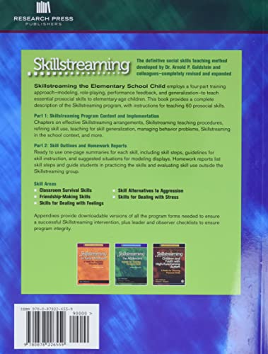 Skillstreaming the elementary school child employs a four-part training approach: modeling, role-playing, performance feedback, and generalization which teach essential prosocial skills to elementary-age children. This book provides a complete description of the Skillstreaming program with instructions for teaching 60 prosocial skills.