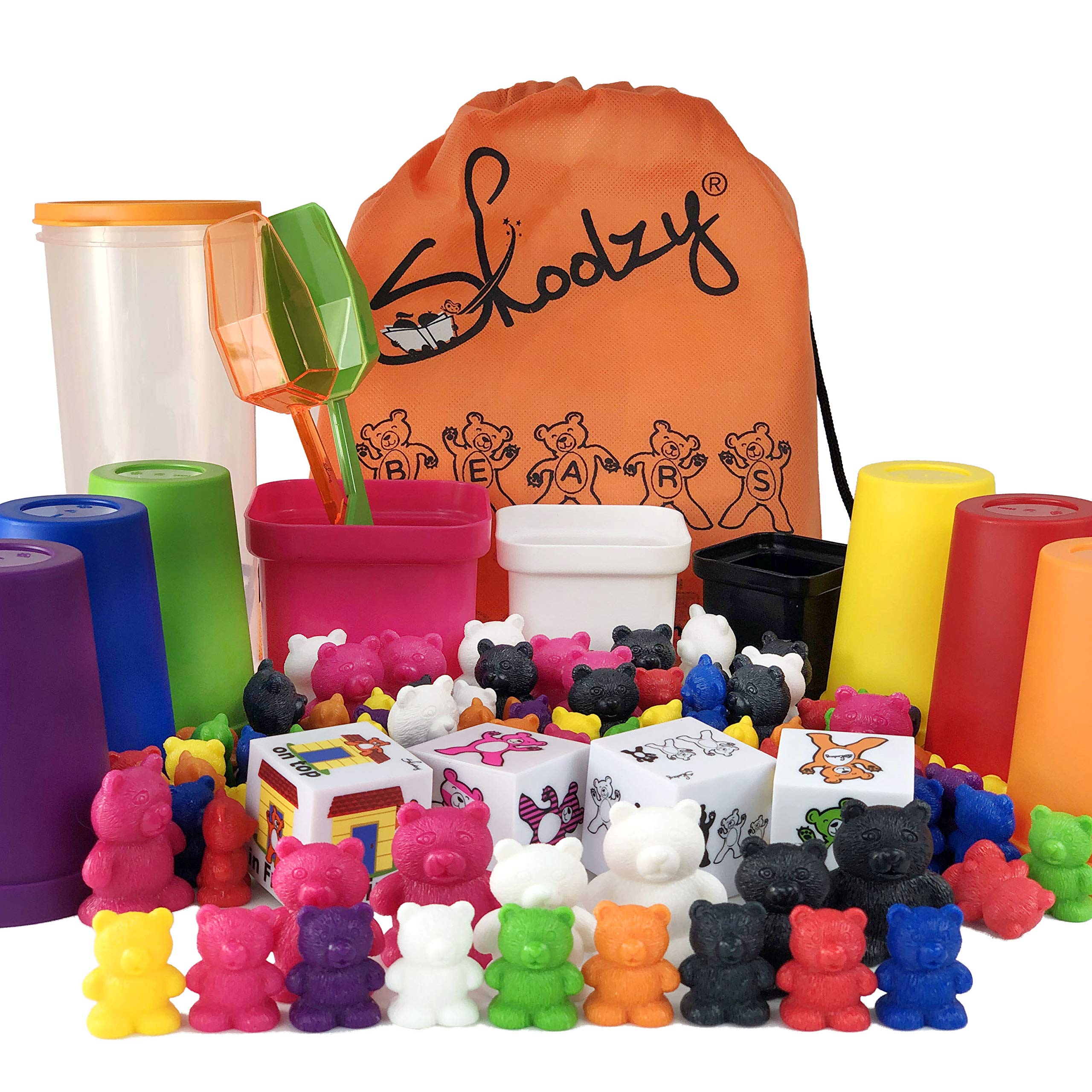 Skoolzy Educational Toys – 114 pieces Language and Rainbow Counting Bears with Sorting Cups, Dice Scooper and Storage Bags Help young students to master early math skills with these bear shaped counting cubes. You can use these toddler Montessori preschool learning toys to motivate your child. These toddler toys have many uses from color sorting toys for toddlers and color matching game to preschool manipulatives and math counters manipulatives for elementary. Use the family bear set and size dice to teach about family and sizes; small medium and large. Add Prepositions and positional language into toddler activities using the rainbow cups and position dice. Teach either or, along with colors with the options dice! Give your child a head start with these educational toys and begin building smart minds! Children learn positions, counting, sorting, and color recognition with 96 bear counters in 9 bright colors, with matching sorting cups that are stackable, storage tube, activity guide and videos Ideal for ages 3+ Great for counting to 100 by ones, twos, fives and tens, grouping, and one-to-one correspondence Use for more complex patterning activitiesHelp young students master early math skills for academic success with these fun plastic teddy counters These Skoolzy manipulatives are great for teaching early childhood learning concepts. Hands-on manipulative are great for learning counting, sorting, grouping, addition, and subtraction. This teddy counting toy teaches math skills, patterning, and color recognition. Counting and moving the bears on their own or into the matching cups develops a visual and tactile relationship with numbers and early math concepts–but to a child sliding, sorting and counting with this math toy, it just feels like fun!;