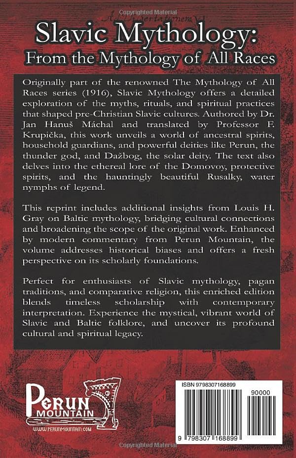 Slavic Mythology: From the Mythology of All Races By Jan Hanus Machal, Louis Herbert Gray, and Perun Mountain Originally part of the renowned The Mythology of All Races series (1916), Slavic Mythology offers a detailed exploration of the myths, rituals, and spiritual practices that shaped pre-Christian Slavic cultures. Authored by Dr. Jan Hanus Machal and translated by Professor F. Krupicka, this work unveils a world of ancestral spirits, household guardians, and powerful deities like Perun, the thunder god, and Dazbog, the solar deity. The text also delves into the ethereal lore of the Domovoy, protective spirits, and the hauntingly beautiful Rusalky, water nymphs of legend. This reprint includes additional insights from Louis H. Gray on Baltic mythology, bridging cultural connections and broadening the scope of the original work. Enhanced by modern commentary from Perun Mountain, the volume addresses historical biases and offers a fresh perspective on its scholarly foundations. Perfect for enthusiasts of Slavic mythology, pagan traditions, and comparative religion, this enriched edition blends timeless scholarship with contemporary interpretation. Experience the mystical, vibrant world of Slavic and Baltic folklore, and uncover its profound cultural and spiritual legacy.