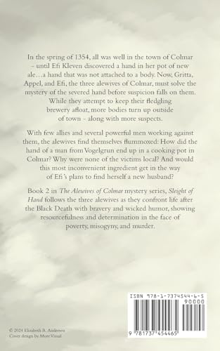 In the spring of 1354, all was well in the town of Colmar – until Efi Kleven discovered a hand in her pot of new ale…a hand that was not attached to a body. Now, Gritta, Appel, and Efi, the three alewives of Colmar, must solve the mystery of the severed hand before suspicion falls on them. While they attempt to keep their fledgling brewery afloat, more bodies turn up outside of town – along with more suspects. With few allies and several powerful men working against them, the alewives find themselves flummoxed: How did the hand of a man from Vogelgrun end up in a cooking pot in Colmar? Why were none of the victims local? And would this most inconvenient ingredient get in the way of Efi’s plans to find herself a new husband? Book 2 in The Alewives of Colmar mystery series, Sleight of Hand follows the three alewives as they confront life after the Black Death with bravery and wicked humor, showing resourcefulness and determination in the face of poverty, misogyny, and murder.