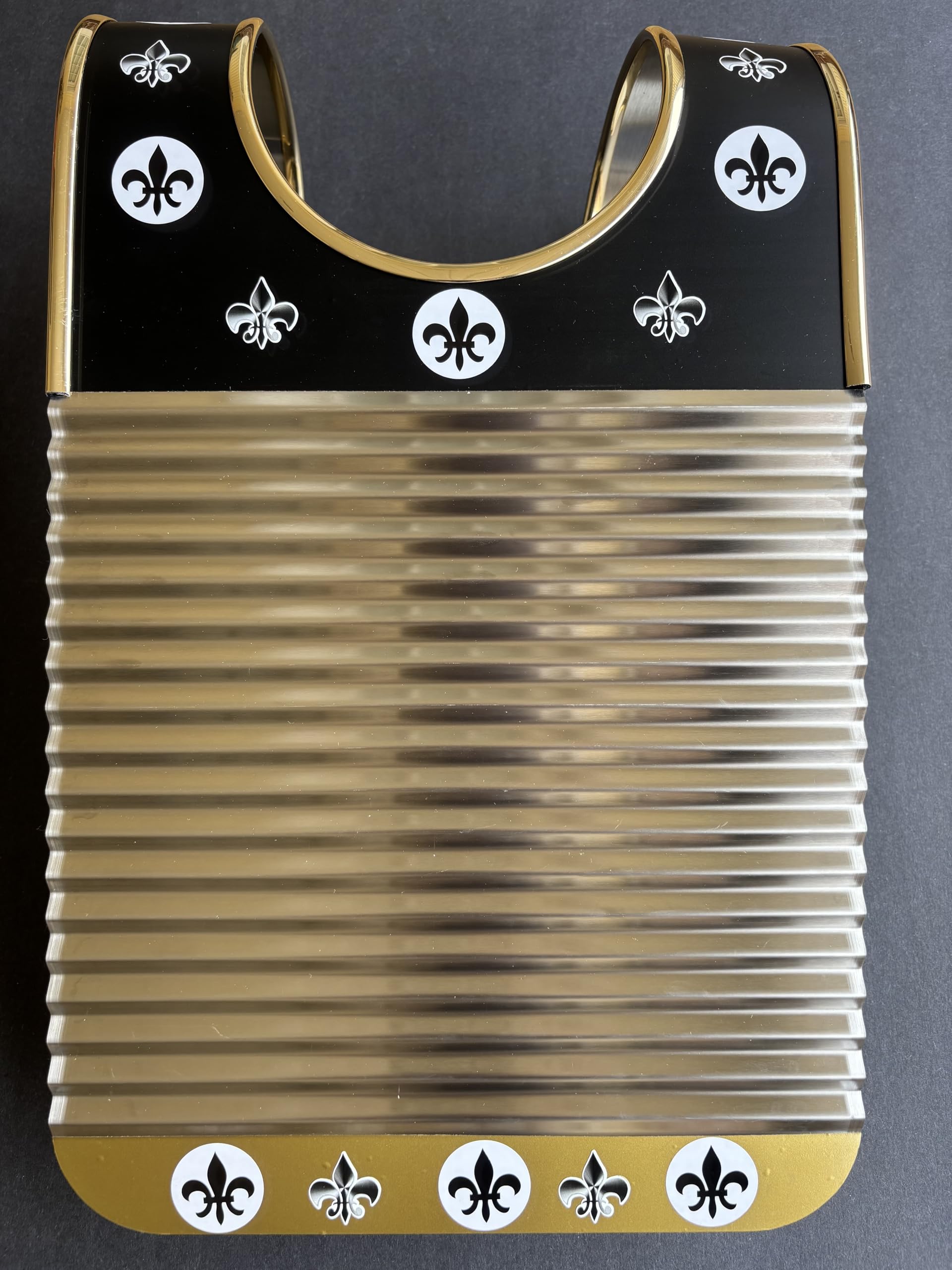Introducing the Small Handmade BLACK & GOLD Zydeco Washboard Percussion Instrument Washboard – the perfect addition to your musical collection! With its playful design and quirky charm, this washboard percussion instrument is sure to bring a whole new level of fun to your performances. Grab one now and add a touch of humor and style to your music!