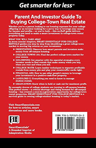 About The Book Whether you’re a parent looking to cut housing expenses for your college offspring or an investor looking for a savvy way to leverage your money for income and profits — or you’re both — this no-fluff guide delivers everything you need in under 100 pages to make a smart investment in college-town rental property today. WHAT YOU WILL TAKE AWAYIn seven concise chapters, SMART ESSENTIALS FOR COLLEGE RENTALS takes you step by step from identifying a great college-town market to scoring big returns on your investment: >> ORIENTATION: Discover how smart parents and investors make money from off-campus housing.>> COLLEGE TOWNS 101: Find the perfect college-town market for your money.>> GOLDMINES: Get smarter with the essential strategies every investor needs to find rentals that make money when you buy, when you rent and when you sell.>> COLLEGE MATH: Learn insider techniques to separate profitable rentals from money pits and play your counteroffer cards just right.>> FINANCIAL AID: How to use other people’s money to leverage your investment in a positive-cash-flow property.>> LANDLORD U: Everything you need to know to manage student rentals and avoid nightmare tenants.>>GRADUATION: Know when to hold or cash out for maximum profit. By necessity droves of college students are turning to off-campus housing. This perfect storm – a critical shortage and rising demand for off-campus housing — has created a once-in-a-generation opportunity for college-town rental properties. SMART ESSENTIALS FOR COLLEGE RENTALS is a survival guide to owning college-student housing in today’s market. About The SeriesIf you want to get smarter for less, then SMART ESSENTIALS guides are all you need. SMART ESSENTIALS readers appreciate the smart, useful, distilled information that goes straight to the point. Certainly, you can swim through the tides of endless online articles searching for useful information. Yes, you can slog through full-length how-to books trying to glean the one chapter you really need hidden in the general filler. But SMART ESSENTIALS readers are too smart for that. You want the information now. You want it smartly presented. You want it current for today’s market. Mostly you want your information short, concentrated and applicable to your situation — you want SMART ESSENTIALS. About The AuthorAs a publisher, author, speaker and one of the real estate industry’s leading authorities in marketing and lead management since 1979, Dan Gooder Richard is the author of SMART ESSENTIALS FOR COLLEGE RENTALS: Parent and Investor Guide To Buying College-Town Real Estate and SMART ESSENTIALS FOR REAL ESTATE INVESTING: How To Build Wealth In Real Estate Today. Dan is also the series editor of other SMART ESSENTIALS books including: SMART ESSENTIALS FOR SELLING YOUR HOME: How To Get The Highest Price In The Shortest Time, SMART ESSENTIALS FOR BUYING A HOME: How To Get The Best Price And The Lowest Payment and SMART ESSENTIALS FOR BUYING FORECLOSURES: Finding Hidden Bargains For Home Or Profit. All SMART ESSENTIALS books are available as paperback, hardcover and eBook editions at www.SmartEssentials.com. Dan’s first real estate marketing book, REAL ESTATE RAINMAKER(R): Successful Strategies for Real Estate Marketing, was published by John Wiley & Sons in 2000. Dan’s second book in 2004, REAL ESTATE RAINMAKER(R): Guide to Online Marketing, was also published by John Wiley & Sons. Dan is also creator of the RAINMAKER LEAD SYSTEM(R) now in use by thousands of real estate professionals nationwide.