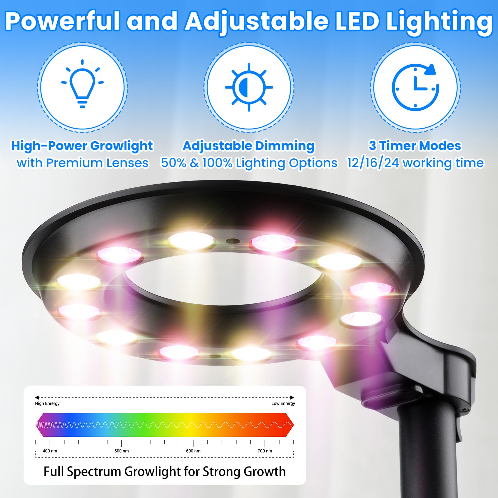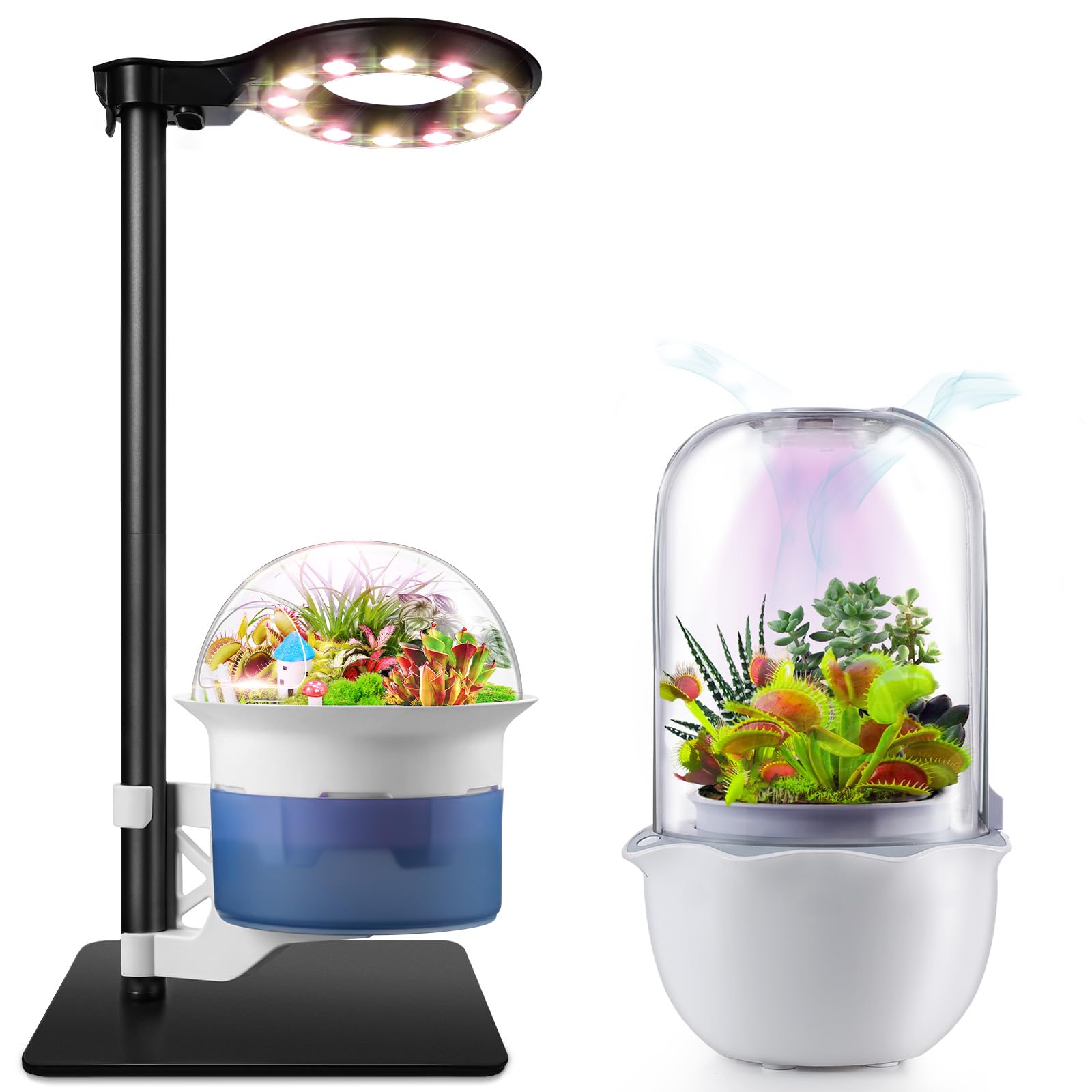 Versatile Plant Light and Self Watering Pot Setup – Perfect for Indoor Gardening Perfect for a Variety of Plants This system supports succulents, moss, cacti, small tomatoes, and flowers, making it ideal for a succulent terrarium or a carnivorous plant terrarium like a terrarium for venus fly trap. It’s a great addition for plant lovers looking to create a planter terrarium. Flexible for Soil and Hydroponic Growth with Self Watering Planters for Indoor Plants Designed with self watering plant pots, this unit adapts easily to both soil and hydroponic growth. Compatible with lordem grow lights for indoor plants and indoor plant lights for growth, it’s the ultimate solution for creating a terrarium container with minimal maintenance. Sunlight-Like Full Spectrum LED with Bottom Watering Pots for Indoor Plants Our high-efficiency self watering plant pot features bottom watering pots for indoor plants that provide steady hydration, mimicking natural sunlight to enhance plant health. Smart Timer & Dimming for Customizable Lighting This indoor plant lights for growth system has adjustable timers and dimming options, perfect for managing light intensity across different plant needs. Adjustable Height and Angle for All Growth Stages Our system adjusts in height and angle to accommodate all growth stages, making it perfect for plants of various sizes, including those in 8 inch self watering pots for indoor plants and 10 inch self watering pots for indoor plants. Stable Metal Stand for Self Watering Planters and Pots Built on a heavy-duty metal stand, this self watering flower pots for indoor plants system is designed for durability and stability, providing reliable support for plants. Large Reservoir for Easy Plant Self Watering Pot Convenience With large self watering pots for indoor plants, this setup keeps plants hydrated for up to 7 days, reducing the need for daily watering. Th