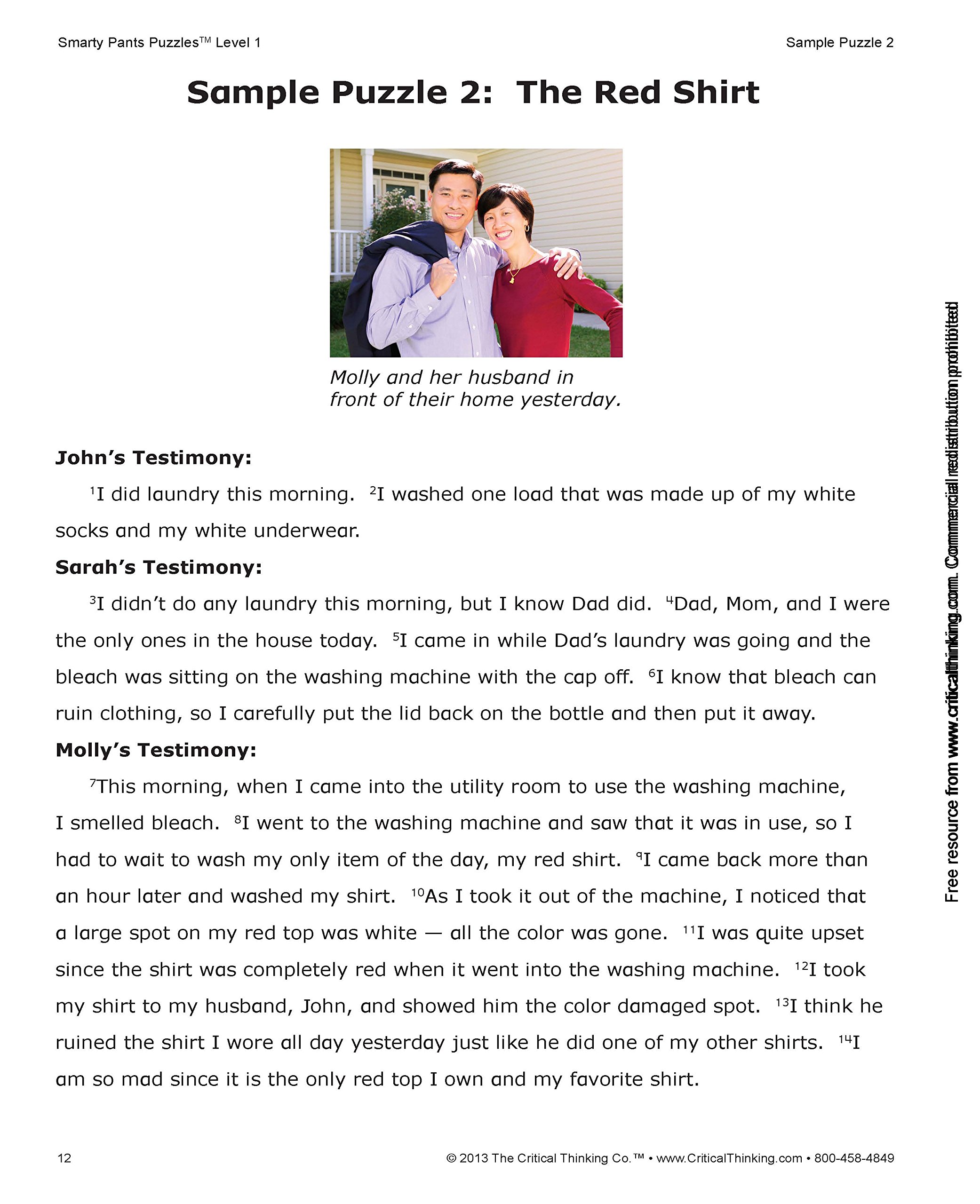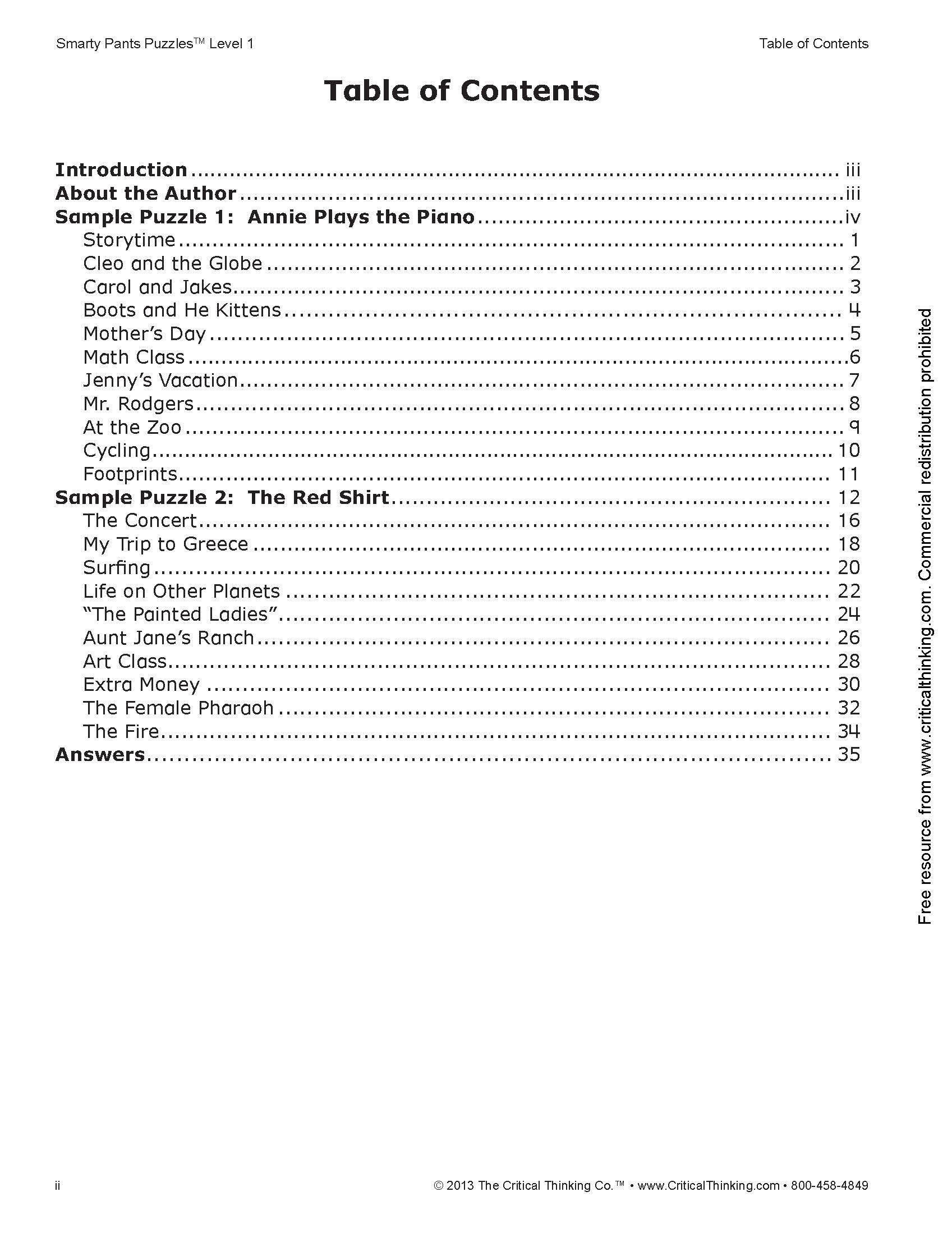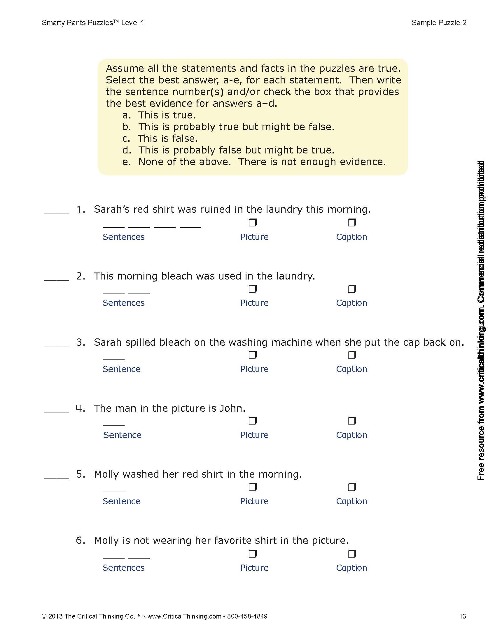 Smarty Pants Puzzles are fun, quick, and engaging and best of all they develop a host of critical thinking skills. Students must read the puzzle and analyze the pictures looking for evidence needed to answer the questions. This depth of analysis produces strong reading comprehension skills and teaches students how to find and evaluate evidence. These puzzles can be solved independently or used for educational fun at home or in a classroom. Skills: Inference,Deduction, Conclusion, Identification and Analysis of Evidence, Synthesis and Analysis of Comprehension