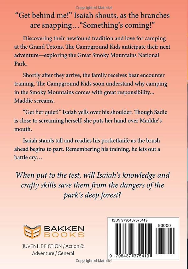 “Get behind me!” Isaiah shouts, as the branches are snapping…”Something’s coming!” Discovering their newfound tradition and love for camping at the Grand Tetons, The Campground Kids anticipate their next adventure–exploring the Great Smoky Mountains National Park. Shortly after they arrive, the family receives bear encounter training. The Campground Kids soon understand why camping in the Smoky Mountains comes with great responsibility… Maddie screams. “Get her quiet!” Isaiah yells over his shoulder. Though Sadie is close to screaming herself, she puts her hand over Maddie’s mouth. Isaiah stands tall and readies his pocketknife as the brush ahead begins to part. Remembering his training, he lets out a battle cry… When put to the test, will Isaiah’s knowledge and crafty skills save them from the dangers of the park’s deep forest? Series Description: Isaiah, his sister Sadie, and their cousin Ethan, The Campground Kids, will take you on a journey of epic camping adventures. Join this squad as they begin exploring the most loved National Parks encountering mystery, challenge, survival, and more in this action packed book series.