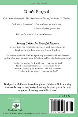 Sneaky Tricks for a Powerful Memory offers tips for remembering facts and procedures in English, Math, Science, and Social Studies. The mnemonics in this book are a great way to remember historical events, spelling rules, math formulas, word definitions, and lots of other important stuff.Need to memorize the Presidents? You need this book!Need to multiply fractions? You need this book!Need to classify your animals? You need this book!Need to write an essay? You need this book!Designed with full-color illustrations throughout, this incredible learning resource is easy to use, makes learning fun, and paves the way to greater learning in middle school.