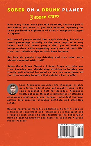 Are you tired of waking up with a pounding headache, feeling sick and regretful after yet another night of drinking? Struggling with the negative feedback loop of alcohol and ready to break free? Look no further than the international best-selling series, Sober On A Drunk Planet……. Maybe you’ve been stuck in a negative feedback loop of drink > hangover > regret > repeat and have had enough of the damaging effects of alcohol. Perhaps you’re at a crossroads in life where you’re feeling overwhelmed by the negative effects of alcohol. Maybe you’re tired of waking up with that same sense of regret and exhaustion, knowing that your drinking has hurt those around you – and yourself. Maybe your hangovers last longer than 24 hours, and you want to start living an extraordinary life in sobriety with more time, more energy and more money to do what you really want – instead of being hungover and unhappy. In this international bestselling series – Sober On A Drunk Planet – 3 Sober Steps, you will be guided through uncommon steps that can help you towards a more fulfilling life away from the negative impact of alcohol. Even if you have been sober for some time, you will learn life-changing tools and processes that will help you to become more self-aware while motivating you to take action in other areas of your life. Sean Alexander provides powerful insights from his time in rehab, working the twelve-step program, and his professional experience gained as a qualified therapist, strength coach and from running the SOADP community. In 3 Sober Steps, you will discover: How to become self-aware and why this is the key to understanding your relationship with alcohol Why dreams without goals are just dreams and how setting goals is the key to finding purpose beyond the bottle How to take action toward goals and the shocking truth about motivation Why building intuition will help master your sobriety and how to build it for the long term How to understand cravings and triggers and how to combat them in any given situation Why emotions are the portal to a happy life and how to master your emotions to avoid relapsing How to move past resentment and why becoming present is the most powerful tool you can use Why your ego is shielding your actual reality and how it can stop you from staying sober How old ways won’t open new doors and how to create a new alcohol-free life Why exercise and gut health can help you stay sober and how improving your gut-brain axis is key to a happy life How to understand your vibrational energy and why you will want to protect it at all costs Why you will want to stay sober on a drunk planet and how doing so will elevate your life …….and much more. You will also get access to Bonus Material that will help you in your sobriety journey, including downloadable resources, email support, podcasts, access to the SOADP community and more. Imagine a life without ‘never agains’, where you feed a positive feedback loop of wake up fresh > make the most of your life > repeat, which replaces the negative feedback loop of hangover > low energy > feel sick > regret > repeat. If you want to join the millions of people enjoying an extraordinary life alcohol-free, with no hangovers and no regrets, grab yourself a copy of Sober On A Drunk Planet 3 Sober Steps Today. Scroll to the top and click ‘Buy Now’.