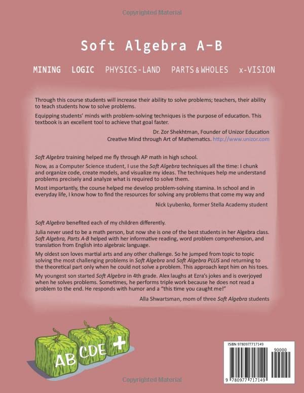 * If you want to learn how to solve sophisticated problems, study Soft Algebra! * THIS LISTING IS FOR SOFT ALGEBRA A-B ONLY TEXTBOOK C-E, WORKBOOKS, SOFT ALGEBRA PLUS, AND MANUALS ARE SOLD SEPARATELY This book was designed to be a course which prepares students for the STEM careers of their dreams. With that being said, Soft Algebra helps any student to build a solid foundation in problem solving for life–that includes students with non-STEM career plans, and those who feel lost when math involves letters. Soft Algebra softens the barriers between arithmetic, problem-solving, and algebra by teaching algebraic concepts on an intuitive level. Many Soft Algebra students participate in AMC, MATHCOUNTS, and other math competitions. Soft Algebra roughly matches the material of a 7th grade math curriculum in the U.S.A. Actually, this course is appropriate for ages 5-125; every student’s journey is unique! The most advanced students supplement their studies using Soft Algebra PLUS. Soft Algebra students learn dozens of problem-solving strategies–they organize information and design models, solve problems with ratios and rates of change, work with radicals and geometric shapes, deal with proportions and percentages. Throughout all these topics students use conceptual understanding to solve problems rather than a set of memorized “rules of math”. Soft Algebra is part of EzraMath(tm), a comprehensive math program which integrates mathematics education with developing intelligent thinking through active problem solving. REAL RESULTS: Soft Algebra has helped students drastically increase their problem-solving abilities and develop interest in math-based fields; these students have become Mechanical Engineers, Electrical Engineers, Startup Founders, Physicists, Computer Scientists, and more. SIMULATED CONTEXT LEARNING: Soft Algebra teaches problem solving in context. Sometimes, students must use the Internet in order to solve a story problem: find a statistical connection between height and age of people, analyze how gold prices change with time, or determine the average salinities of agricultural vs. potable water. CONTENT SUMMARY: Soft Algebra is available as a single full color hardcover textbook or a two-volume black-and-white softcover set. Soft Algebra course is supplemented by FIVE WORKBOOKS and a TEACHER’S MANUAL with detailed solutions. Soft Algebra contains over 800 unique problems and exercises. PARTS A-B of SOFT ALGEBRA cover: strategies for problem comprehension radicals, set notation, and substitution cartesian graphing for linear, quadratic, and cubic curves, as well as various other functions and non-functions PARTS C-D cover: properties of matter, measurable attributes, SI and customary units, unit conversion rate of change, percentage, proportions, and ratios use of auxiliary elements in geometry problems using visual models rather than algebraic equations PART E covers: formal mathematical approaches (properties of exponents and properties of equality) creating and solving equations and systems Advanced students supplement their studies with SOFT ALGEBRA PLUS, which covers: models for problems with patterns additional problem-solving techniques strategies for improving creative thinking, and much more! Soft Algebra PLUS contains 200 additional problems and exercises.