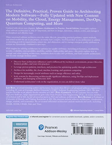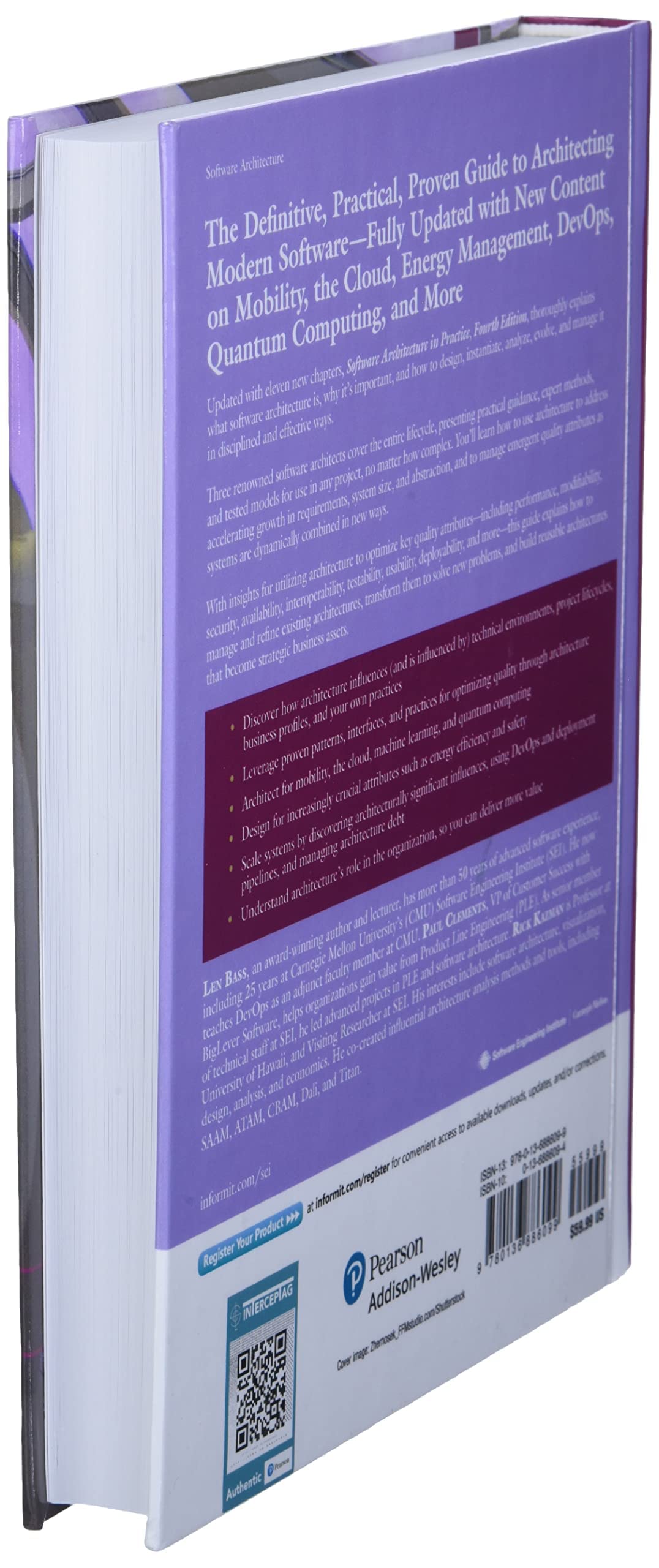 The Definitive, Practical, Proven Guide to Architecting Modern Software–Fully Updated with New Content on Mobility, the Cloud, Energy Management, DevOps, Quantum Computing, and More Updated with eleven new chapters, Software Architecture in Practice, Fourth Edition, thoroughly explains what software architecture is, why it’s important, and how to design, instantiate, analyze, evolve, and manage it in disciplined and effective ways. Three renowned software architects cover the entire lifecycle, presenting practical guidance, expert methods, and tested models for use in any project, no matter how complex. You’ll learn how to use architecture to address accelerating growth in requirements, system size, and abstraction, and to manage emergent quality attributes as systems are dynamically combined in new ways. With insights for utilizing architecture to optimize key quality attributes–including performance, modifiability, security, availability, interoperability, testability, usability, deployability, and more–this guide explains how to manage and refine existing architectures, transform them to solve new problems, and build reusable architectures that become strategic business assets. Discover how architecture influences (and is influenced by) technical environments, project lifecycles, business profiles, and your own practices Leverage proven patterns, interfaces, and practices for optimizing quality through architecture Architect for mobility, the cloud, machine learning, and quantum computing Design for increasingly crucial attributes such as energy efficiency and safety Scale systems by discovering architecturally significant influences, using DevOps and deployment pipelines, and managing architecture debt Understand architecture’s role in the organization, so you can deliver more value Register your book for convenient access to downloads, updates, and/or corrections as they become available. See inside book for details.