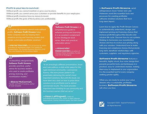 Profit is your key to survival. Without profit, you cannot maintain or grow your business. Without profit, you cannot serve your customers or provide benefits to your employees. Without profit, investors have no reason to invest. Without profit, the goals of the business are unattainable. In Software Profit Streams, serial entrepreneurs Jason Tanner and Luke Hohmann unveil the essential tools and processes for creating profitable software-enabled solutions that have longterm impact. Learn how to apply the Profit Stream Canvas to systematically understand, design, and implement pricing and licensing choices that increase profit throughout the industry and solution lifecycle. Discover how to use systems thinking to harmonize your monetization choices and how to evolve your pricing along with your solution. Understand how to make licensing and compliance choices that promote longterm, beneficial relationships with customers, suppliers, and regulatory agencies. Software Profit Streams features a beautiful, highly visual, four-color design that presents powerful tools and techniques in a practical, easy-to-understand manner, making them easy to implement in your organization. It is the essential tool for every company seeking greater agility. When you are ready to evolve your value streams into a sustainable, profitable business, Software Profit Streams will show you how.