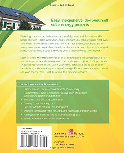 Publisher’s Note: Products purchased from Third Party sellers are not guaranteed by the publisher for quality, authenticity, or access to any online entitlements included with the product. Easy, inexpensive, do-it-yourself solar energy projects Featuring step-by-step instructions and useful photos and illustrations, this hands-on guide is filled with solar energy solutions you can put to use right away. Solar Power for Your Home shows you how to set up a variety of simple, money-saving solar projects quickly and easily, such as a solar water heater, a solar pool pump, solar lighting, a solar oven–and even a solar-powered lawn mower! Learn all about the different types of solar technologies, including passive solar and photovoltaic, and determine which best suits your projects. You’ll get details on assessing current energy use in your home, estimating the costs of solar installations, and calculating your overall savings. Reduce your carbon footprint–and your energy costs–with help from this practical resource. Solar Power for Your Home covers: History, benefits, and potential detriments of solar energy Fundamentals of solar technologies–passive solar, photovoltaic, concentrating solar energy, and more Evaluating home electricity consumption Creating a personal energy plan How and when to contract your solar project Emerging technologies–thin film, nano, and hybrid solar and solar storage Funding options including rebates, incentives, and grants Standards, conversions, and helpful resources