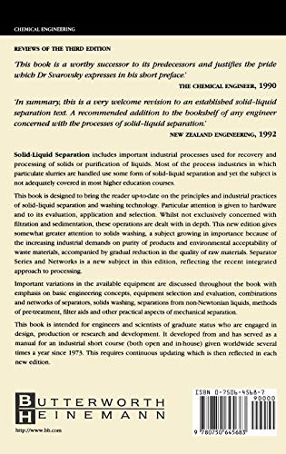 Solid Liquid Separation includes important industrial processes used for recovery and processing of solids or purification of liquids. Most of the process industries in which particulate slurries are handled use some form of solid-liquid separation and yet the subject is not adequately covered in most higher education courses. This book is designed to bring the readers up-to-date on the principles and industrial practices of solid-liquid separation and washing technology. Particular attention is given to hardware and to its evaluation, application and selection. Whilst not exclusively concerned with filtration and sedimentation, these operations will be dealt with in depth. Important variations in the available equipment will be discussed throughout the book with emphasis on basic engineering concepts, equipment selection and evaluation, solids washing, methods of pre-treatment, filter aids and other practical aspects of mechanical separation. This book is intended for engineers and scientists of graduate status who are engaged in design, production for research and development. This book is designed to bring the readers up-to-date on the principles and industrial practices of solid-liquid separation and washing technology. Particular attention is given to hardware and to its evaluation, application and selection. Whilst not exclusively concerned with filtration and sedimentation, these operations are dealt with in depth. Important variations in the available equipment are discussed throughout the book with emphasis on basic engineering concepts, equipment selection and evaluation, solids washing, methods of pre-treatment, filter aids and other practical aspects of mechanical separation. This book is intended for engineers and scientists of graduate status who are engaged in design, production for research and development. Author is the top of his field, and knows well all the latest advances in his subject area Fourth edition of a title which is respected and admired in the world of Chemical Engineering Updated and revised to match the developments in the industry