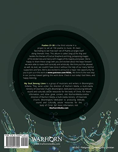 Psalms 21-30 is the third volume in a project to set all 150 psalms to music. It’s been fascinating to see how each set of Psalms arranges itself along thematic lines. This album is called Song of the King and tackles the themes of God as Shepherd and King, juxtaposing images of His tenderness and mercy with images of His majesty and power. We’re happy to share these songs with you and excited about the leaps forward we were able to make both sonically and artistically. We think you’ll be pleased as well. As ever, we couldn’t have done it without the help of our many faithful supporters and fans. We’re also excited to announce a major new opportunity for you to join us in this work at www.patreon.com/MSAL. We think it’s the next step in our journey toward getting this work done. Check it out today! God bless, and happy listening. My Soul Among Lions is a group of musicians and writers in Bloomington, Indiana. They serve under the direction of Warhorn Media, a multi-media ministry of Clearnote Church, Bloomington, dedicated to producing biblically sound and culturally astute resources for the body of Christ. For more information, and other great content, visit WarhornMedia.comthe direction of Warhorn Media, a multi-media ministry of Clearnote Church, Bloomington, dedicated to producing biblically sound and culturally astute resources for the body of Christ. For more information, visit WarhornMedia.com.