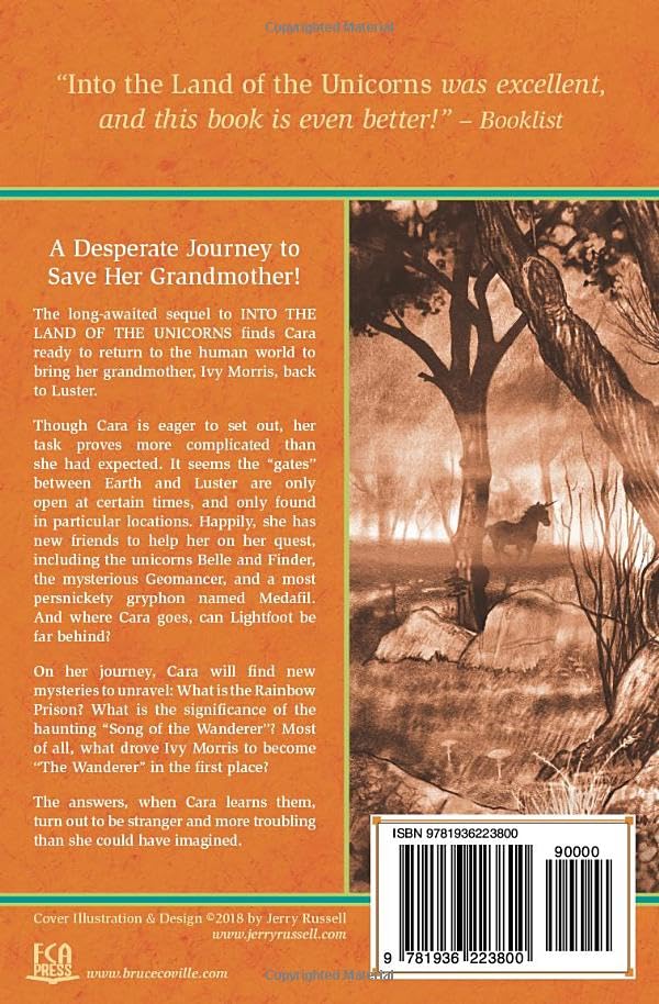 SONG OF THE WANDERER is the amazing second volume of the million-copy-selling UNICORN CHRONICLES. With over 4,000 Five-Star reviews on Good Reads, this mesmerizing sequel to INTO THE LAND OF THE UNICORNS finds Cara Diana Hunter ready to return to the human world to bring her grandmother, Ivy Morris, back to Luster. Alas, the task turns out to be far more complicated than Cara first thought, since the “gates” between Earth and Luster are only open at certain times and only found in particular locations. And there are strange new questions to be answered: What is the Rainbow Prison? What is the significance of the haunting “Song of the Wanderer”? What was it that drove Ivy to become the Wanderer in the first place? Happily, Cara has new friends to help her on her quest, including the unicorns Belle and Finder, the mysterious Geomancer, and a most persnickety gryphon. Adventure, action, heartbreak, triumph, and surprises galore await readers on this return visit to Luster!