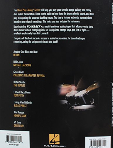 (Drum Play-Along). Play your favorite songs quickly and easily with the Drum Play-Along Series . Just follow the drum notation, listen to the audio to hear how the drums should sound, then play along using the separate backing tracks. The lyrics are also included for quick reference. The audio files are accessed online for download or streaming and include PLAYBACK+ features that allow you to adjust the recording to any tempo without changing the pitch! Includes: Another One Bites the Dust * Billie Jean * Green River * Helter Skelter * I Won’t Back Down * Living After Midnight * The Reason * 21 Guns.