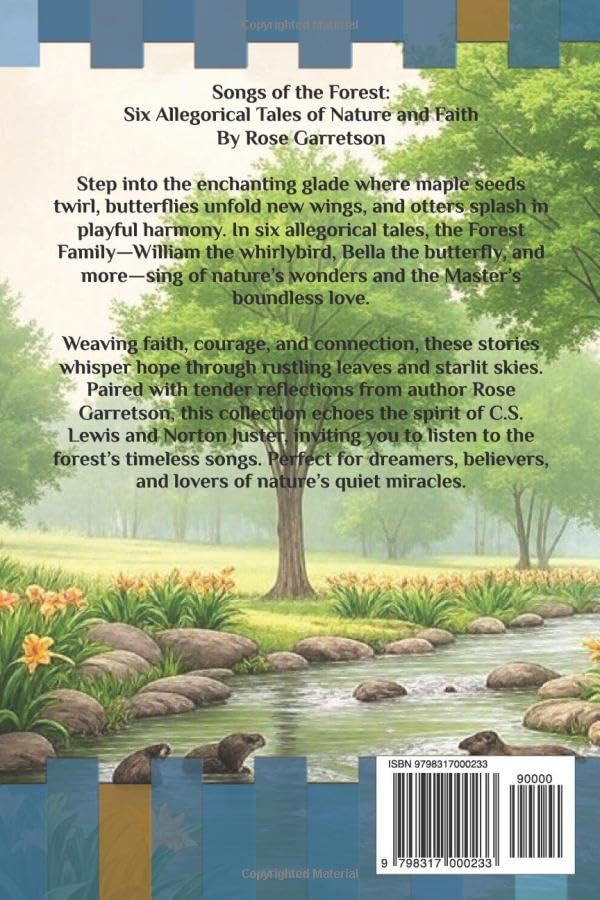 Songs of the Forest: Six Allegorical Tales of Nature and Faith By Rose Garretson Step into the enchanting glade where maple seeds twirl, butterflies unfold new wings, and otters splash in playful harmony. In six allegorical tales, the Forest Family–William the whirlybird, Bella the butterfly, and more–sing of nature’s wonders and the Master’s boundless love. Weaving faith, courage, and connection, these stories whisper hope through rustling leaves and starlit skies. Paired with tender reflections from author Rose Garretson, this collection echoes the spirit of C.S. Lewis and Norton Juster, inviting you to listen to the forest’s timeless songs. Perfect for dreamers, believers, and lovers of nature’s quiet miracles.