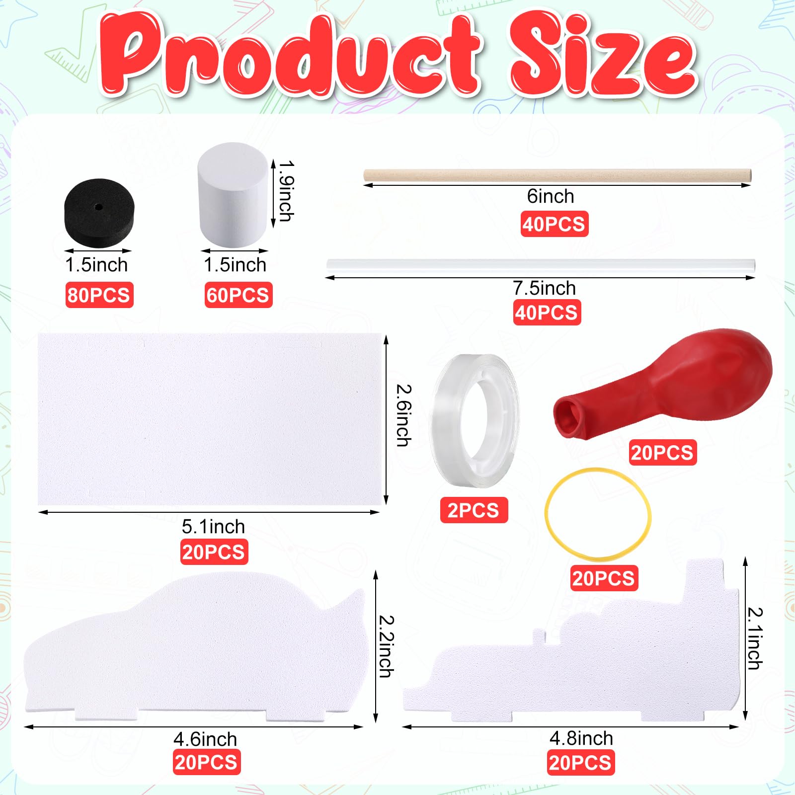 Features: Engage in the world of creativity with our balloon powered cars kit made from quality EVA material. This kit encourages children’s mechanical, scientific, and artistic abilities while ensuring safety and reliability. Ignite the inert scientific and engineering potential within your child with our engaging balloon cars kits. Children can take pleasure in creating their own balloon cars and visualizing the cause and effect relationship of balloon propulsion. This manual STEM learning experience aims to spark curiosity, enhance problem solving skills. Specifications: Material: EVA Color: white Size: about 5 x 2.76 inches/ 13 x 7 cm after assembly Package includes: 20 Set DIY balloon car kits Notes: Manual measurement, please allow slight errors on size. The color may exist a slight difference due to different screen displays. Suitable for people over 12 years old, and it’s recommended to use under the supervision of adults in case of choking risk. Do not overinflate the balloons to avoid bursting.