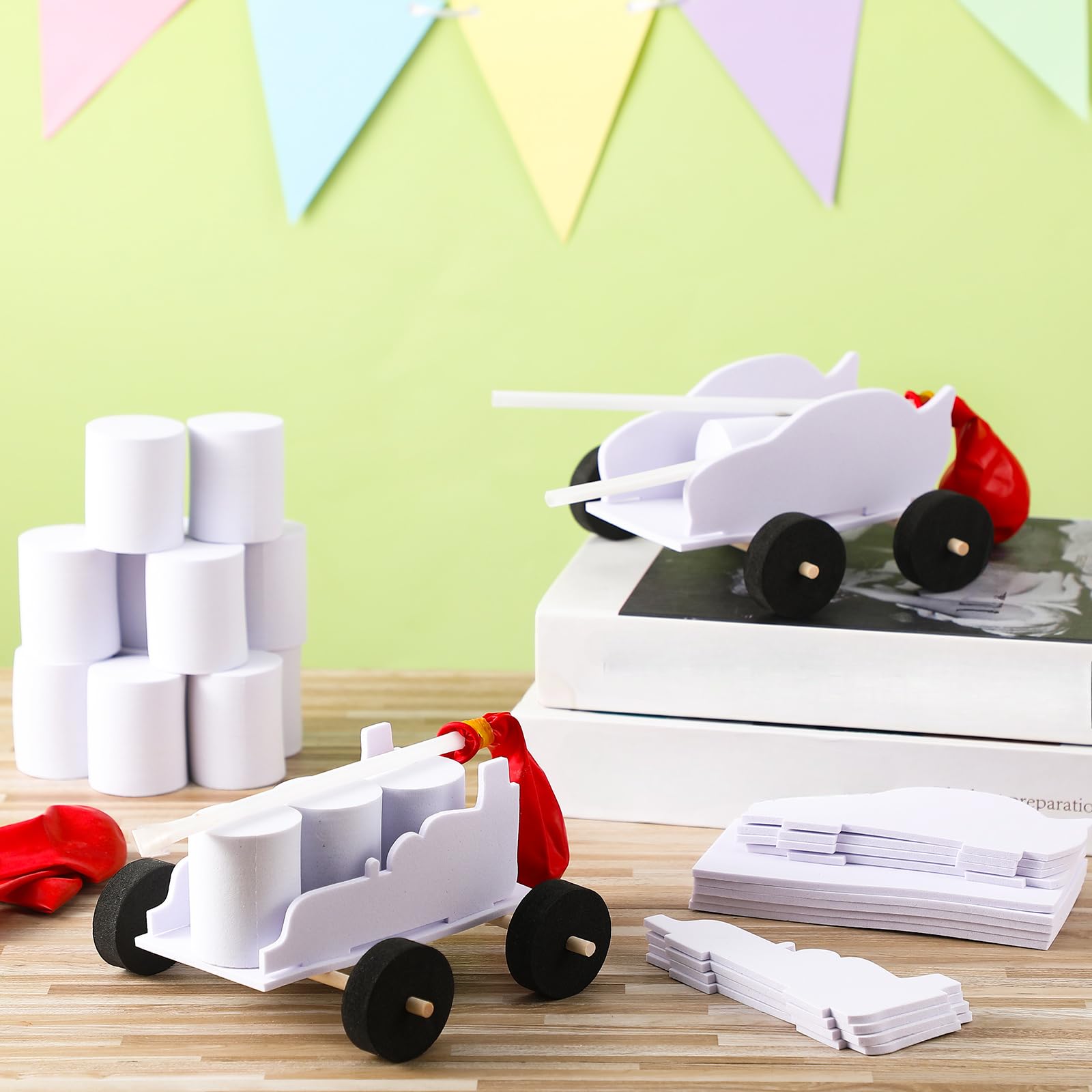 - Fun Experience in the Package: we promise hours of fun with our balloon car kit package, which includes enough balloon powered car parts to build 20 balloon cars; Our package includes 20 set DIY balloon car kits, including 20 baseboards for cars, 20 pairs of car boards, 60 cylinders, 80 wheels, 40 sticks, 20 rubber bands, 20 balloons, and 40 pipes; So siblings, or classmates can equally join the fun