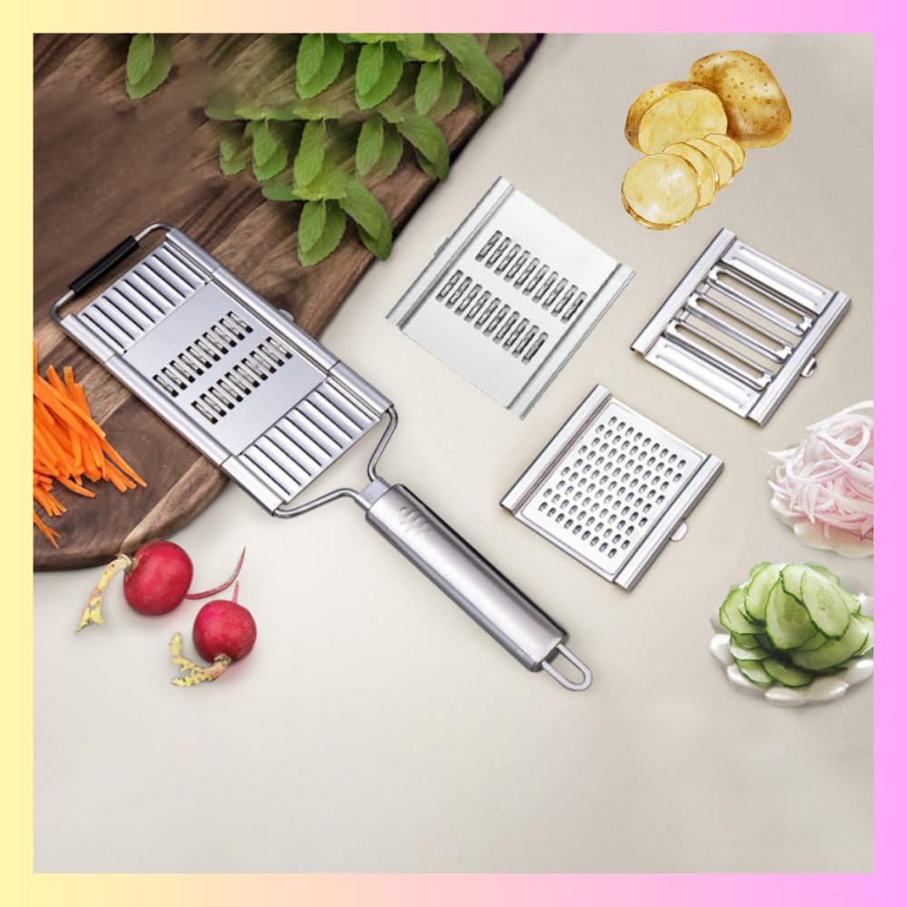 - Quality: Our food slicer, high quality stainless steel grater has 3 interchangeable blades with strong and sturdy frame that can handle pressure without getting bent. The blades are uniform, sharp and durable which provides fast and effortless slicing, grating, chopping, and cutting.