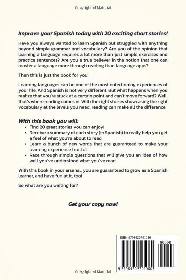Improve your Spanish today with 20 exciting short stories! Have you always wanted to learn Spanish but struggled with anything beyond simple grammar and vocabulary? Are you of the opinion that learning a language requires a lot more than just simple exercises and practice sentences? Are you a true believer in the notion that one can master a language more through reading than language apps? Then this is just the book for you! Learning languages can be one of the most entertaining experiences of your life. And Spanish is not very different. But what happens when you realize that you’re stuck at a certain point and can’t move forward? Well, that’s where reading comes in! With the right stories showcasing the right vocabulary at the levels you need, reading can make all the difference. With this book you will: – Find 20 great stories you can enjoy! – Receive a summary of each story (in Spanish) to really help you get a feel of what you’re about to read – Learn a bunch of new words that are guaranteed to make your learning experience fruitful – Race through simple questions that will give you an idea of how well you’ve understood what you’ve read. With this book in your arsenal, you are guaranteed to grow as a Spanish learner, and have fun at it, too! So what are you waiting for? Get your copy now!