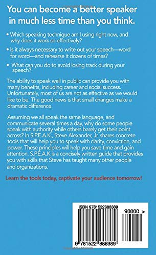 The ability to speak well in public can provide you with many benefits, including career and social success. Unfortunately, most of us are not as effective as we would like to be. The good news is that small changes make a dramatic difference. Assuming we all speak the same language, and communicate several times a day, why do some people speak with authority while others barely get their point across? In S.P.E.A.K, Steve Alexander, Jr. shares concrete tools that will help you to speak with clarity, conviction, and power. These principles will help you– whether you are shy or have a heavy accent–save time and gain attention. S.P.E.A.K is a concisely written guide that provides you with skills that Steve has taught many other people and organizations. Learn the tools today and start captivating your audience tomorrow!