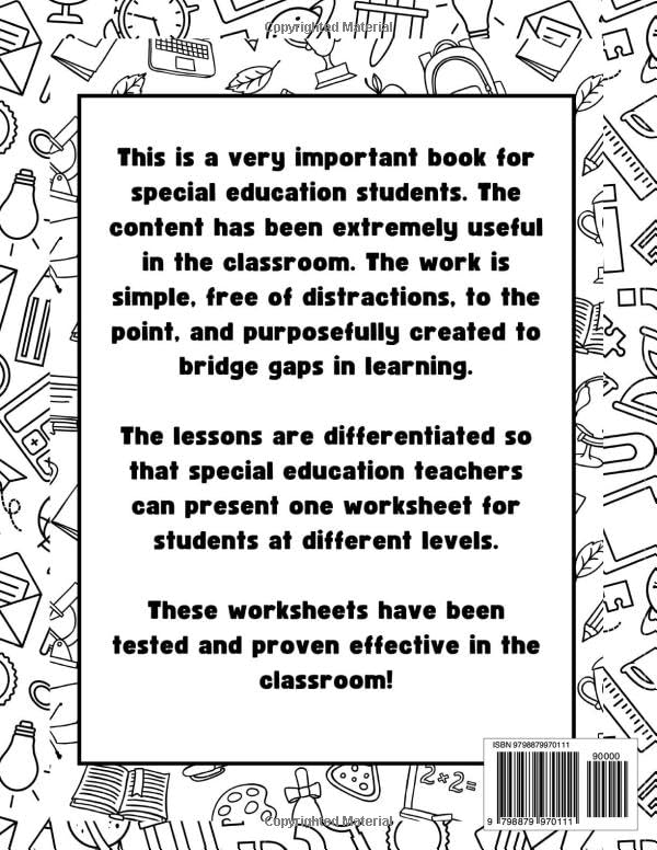 This is a very important book for special education students. The content has been extremely useful in the classroom. The work is simple, free of distractions, to the point, and purposefully created to bridge gaps in learning. The lessons are differentiated so that special education teachers can present one worksheet for students at different levels. These worksheets have been tested and proven effective in the classroom!