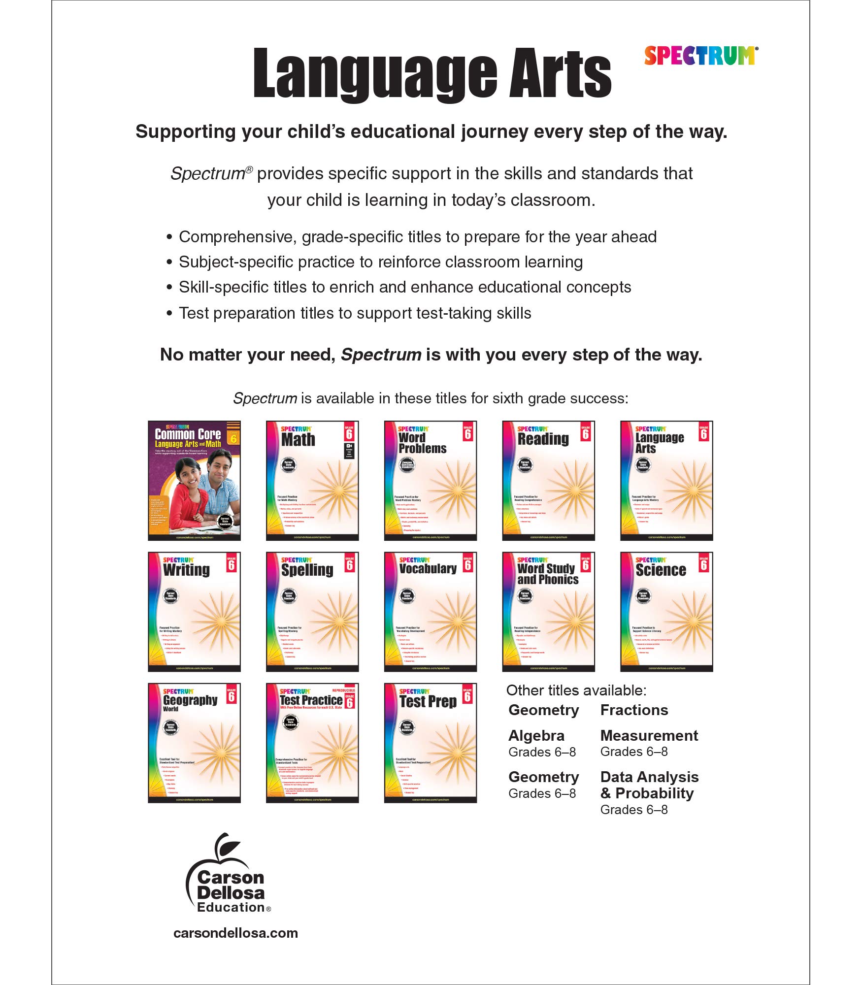 Spectrum Grade 6 Language Arts Workbook for kids ages 11-12 Support your child’s educational journey with Spectrum’s Language Arts 6th Grade Workbook that teaches basic language arts skills to 6th graders. Language Arts workbooks are a great way for kids to learn basic skills such as vocabulary acquisition, grammar, figures of speech, sentence types, and more through a variety of activities that are both fun AND educational! Why You’ll Love This Grammar Workbook Engaging and educational reading and writing practice. “Skits”, “Writing a friendly letter”, and “proofing passages” are a few of the fun activities that incorporate language arts into everyday settings to help inspire learning into your child’s homeschool or classroom curriculum. Testing progress along the way. Lesson reviews test student knowledge before moving on to new and exciting lessons. An answer key is included in the back of the 6th grade book to track your child’s progress and accuracy. Practically sized for every activity The 184-page 6th grade workbook is sized at about 8 inches x 11 inches–giving your child plenty of space to complete each exercise. About Spectrum For more than 20 years, Spectrum has provided solutions for parents who want to help their children get ahead, and for teachers who want their students to meet and exceed set learning goals–providing workbooks that are a great resource for both homeschooling and classroom curriculum. This 6th Grade Language Arts Kids Activity Book Contains: 4 chapters full of tips, fun activities, and lesson reviews An answer key and writer’s guide Perfectly sized at about 8″ x 11″