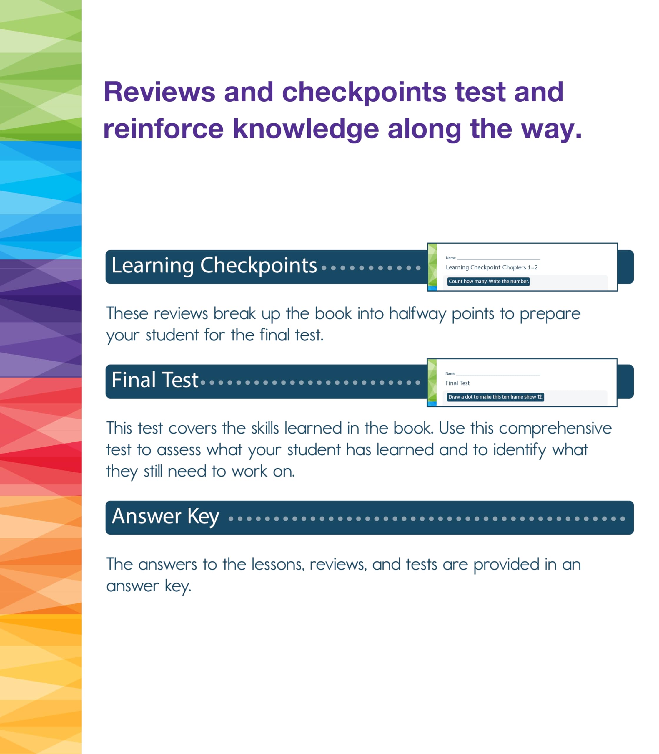 Kindergarten Math Workbook for kids ages 5-6 Support your child’s educational journey Spectrum’s kindergarten workbooks that teach essential math skills to kindergarteners. Spectrum’s math kindergarten workbook is a great way for students to learn kindergarten math skills such as addition, subtraction, place value, and more through a variety of problem-solving activities that are both fun AND educational! Why You’ll Love This Math Book Engaging and educational math activities. Counting and writing numbers and identifying shapes are a few of the activities included to help inspire math learning. Helping your child along the way. Parent support pages are included at the beginning of each chapter with helpful definitions, tools and tips, and a skills list to provide a spectrum of support for your leaner. An answer key is also included. Practically sized for every activity The 192-page math workbook is sized at about 8.4″ x 10.9″–giving your child plenty of space to complete each exercise. About Spectrum For more than 20 years, Spectrum has provided solutions for parents who want to help their children get ahead, and for teachers who want their students to meet and exceed set learning goals–providing workbooks that are a great resource for both homeschooling and classroom curriculum. The Kindergarten Math Workbook Contains: Parent support pages at the beginning of each chapter Answer key