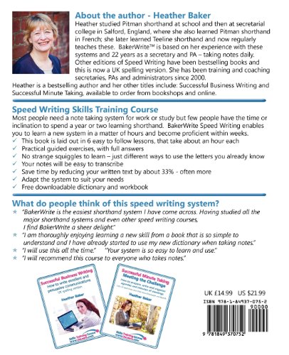Speed Writing Skills Training Course: Speedwriting, a guide to faster note taking, an easy to learn alternative to shorthand. Over 40 000 copies sold worldwide. Most people need a note taking system for work or study but few people have the time or inclination to spend a year or two learning shorthand. BakerWrite Speed Writing enables you to learn a new system in a matter of hours and become proficient within weeks. This is the UK spelling edition. For our world spelling edition please search for 9781849370110. This book is laid out in 6 easy to follow lessons, that take about an hour each. Practical guided exercises, with full answers, in each chapter and each session is rounded off with a dictation passage (available from http: //www.UoLearn.com). Now includes, for the fourth edition, an extended 2000 word speedwriting dictionary. Save time and become more efficient taking dictation, in meetings, on the telephone, in lectures or interviews. No strange squiggles to learn – just different ways to use the letters you already know. Your notes will be easy to transcribe. Heather studied Pitman shorthand at school and then at secretarial college in England; she later learned Teeline shorthand and now regularly teaches these. BakerWriteTM is based on her experience with these systems and 22 years as a secretary and PA – taking notes daily. She has been training and coaching secretaries, PAs and administrators since 2000. Please note there is an alternative edition of this book, Easy 4 Me 2 Learn Speed Writing. Heather had over twenty years’ experience as a secretary and PA before setting up Baker Thompson Associates Limited in 2000. The company specializes in the training and development of secretarial and administrative staff, www.bakerthompsonassoc.co.uk. She now travels all over the world working with companies to enable their staff to work more effectively. She developed this speed writing system to fulfil a need for a quick and easy way for people to take notes. The course became very popular and she was often asked if there was a book with the basics of the system – so here it is! To contact Heather please visit the speedwriting section of the publishers’ website, http: //www.UoLearn.com What do people think of this speed writing system? “The principles are very easy to follow, and I am already using it to take notes.” “BakerWrite is the easiest shorthand system I have come across. Having studied all the major shorthand systems and even other speed writing courses, I find BakerWrite a sheer delight.” “I will use this system all the time.” “Your system is so easy to learn and use.” “I am 51 years old and have been a secretary more or less since I left school. I took the requisite Pitmans shorthand course whilst at school and have never been able to understand it, all those squiggles and lines. I have used my own speed writing version of words through the years and have managed to get by (as long as I dealt with the notes as soon as I had written them – so it was half memory and half being able to read my own shorthand version). But now, everything is so clear and makes complete sense. I take your book on the train every morning and even after the first reading it completely made sense and I could even remember most of what I had read in the first chapter and believe me my memory for retaining new info is not as it used to be. Even when I was reading your abbreviations I was able to see what they were in a lot of cases before I checked the meaning.” “I am thoroughly enjoying learning a new skill from a book that is so simple to understand and I have already started to implement my new dictionary of words when taking notes.” “A great big thank you for developing a system that is so easy to understand and completely workable and I’m looking forward to showing off my new skills when taking notes (which I will actually be able to understand) at the next board meeting.”