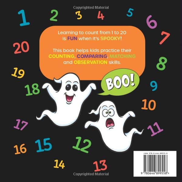 Enjoy the Magic of Spooky Learning in this counting book for toddlers! Learning to count becomes as exciting as a Halloween night filled with costumes and candy in this delightful picture book filled with vibrant, funny illustrations of spooky characters. This engaging numbers book not only teaches children how to count but also sharpens their comparing, matching, and observation skills. Each page is designed to captivate and educate, featuring colourful illustrations that celebrate spookiness without being scary! From ghosts and witches to monsters and haunted houses, each page comes with a counting and thinking challenge. Give your child the gift of numbers wrapped in the fascinating world of spooky delights. Turn each page and watch as their eyes light up with excitement and curiosity. Perfect for kids who love a little bit of spookiness, this book is more than a learning tool; it’s a chance to explore scary things in a safe environment. Don’t miss out on the opportunity to make learning as magical as a trick or treat adventure! Suitable for preschool kids, kindergartens and early years classrooms.