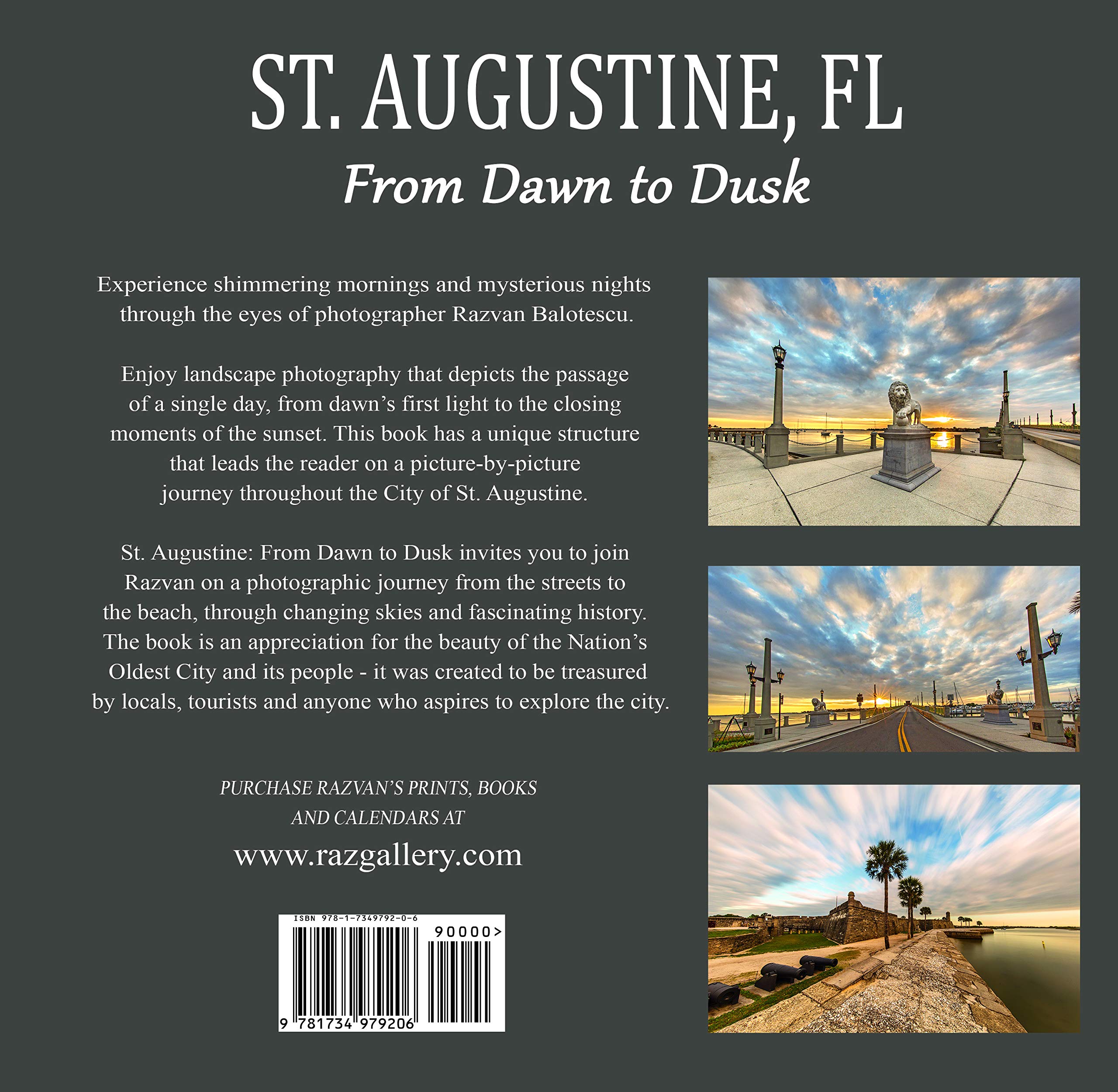 Take an experiential visual tour of the oldest city in the US-St. Augustine, Florida. Travel through the quaint city of St. Augustine from its historic streets to the pristine shore, through vibrant sunsets and breathtaking cityscapes. Become transported back in time as you glimpse into the unique history and must-see sites. Discover its unique charm and character as you stroll along the centuries-old cobblestone streets and admire the vibrant colors splashed along the Old City’s doors. Taken from the lens of award-winning photographer Razvan Balotescu MD, these spectacular photos provide a panoramic glimpse of this historical town from dawn to dusk. This photographic account showcases St. Augustine’s natural beauty and the man-made structures it’s known for-from The Castillo de San Marcos to the St. Augustine Lighthouse. From Dawn to Dusk will ignite your sense of adventure as you admire the awe-inspiring sights that capture the heart and soul of Northeast Florida. This beloved photography coffee table book is treasured by locals, tourists, history-lovers, and those with a wanderlust to travel. Features include – 132 pages, 131 fine art images, Printed in high resolution on high-quality glossy paper, Vibrant and large photographs, Hardcover and dust cover, Approx. 11 by 10 inches, Weighs 2.45 pounds.
