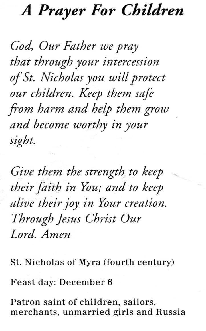 St. Nicholas A Prayer for Children N holy card – laminated – Pack of 25
