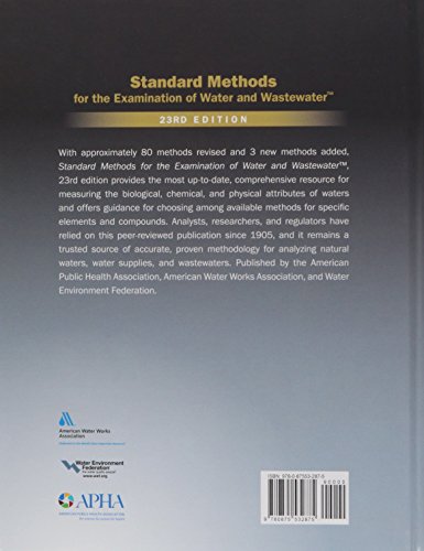 Analysts, researchers, and regulators have relied on this peer-reviewed publication since 1905. The trusted source of accurate, proven methodology for analyzing natural waters, water supplies, and wastewaters. The 23rd edition of Standard Methods for the Examination of Water and Wastewater contains over 400 laboratory methods for the analysis of Dissolved Solids Metals Free and Total Chlorine Odor, Taste, and Flavor Profile Analysis Disinfection By-products Radionuclides Total Organic Carbon Total and Fecal Coliform Laboratories worldwide rely on this comprehensive reference as the trusted source of accurate, proven methodology for analysis of water, water supplies, and wastewater. It is the essential resource for water analysis professionals. The methods in the 23rd edition (as in previous editions) are believed to be the best available, generally accepted procedures for analyzing water, wastewater, and related materials. They represent the recommendations of specialists, ratified by a large number of analysts and others of more general expertise, and as such are truly consensus standards, offering a valid and recognized basis for control and evaluation. All methods are dated to identify which ones changed significantly between editions. New in the 23rd edition Over 80 revised methods and 5 new methods added Extensive revisions to Microbiological Examination (Part 9000) New drinking water method to test for pharmaceuticals and personal care products New, more realistic, visuals to help identify aquatic organisms Revisions to Solids, Cyanide, Nitrate, Dissolved Oxygen, and Biochemical Oxygen Demand Standard Methods is also offered as a subscription service, which includes all the new, revised, and USEPA-approved methods that are full-text searchable, a discussion group and news about the book, its methods and the oversight board.