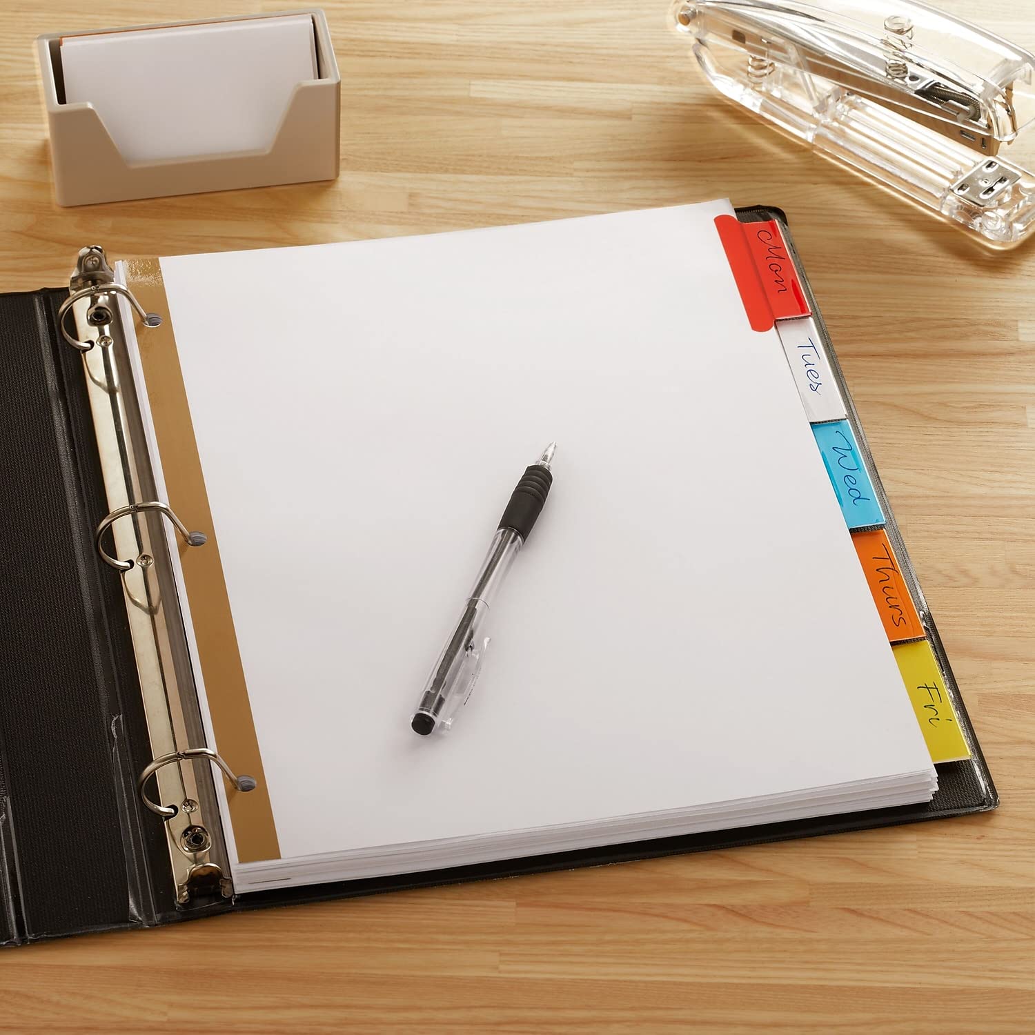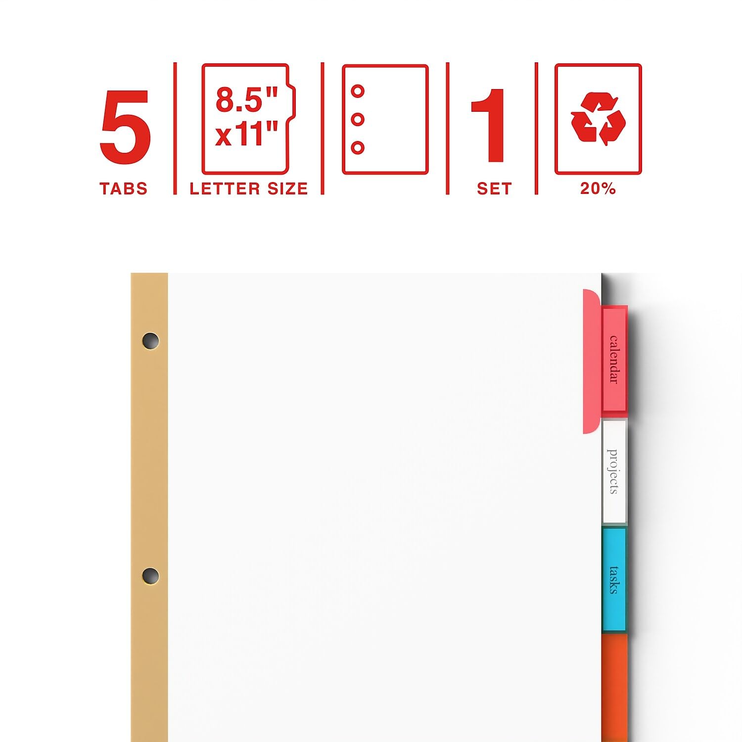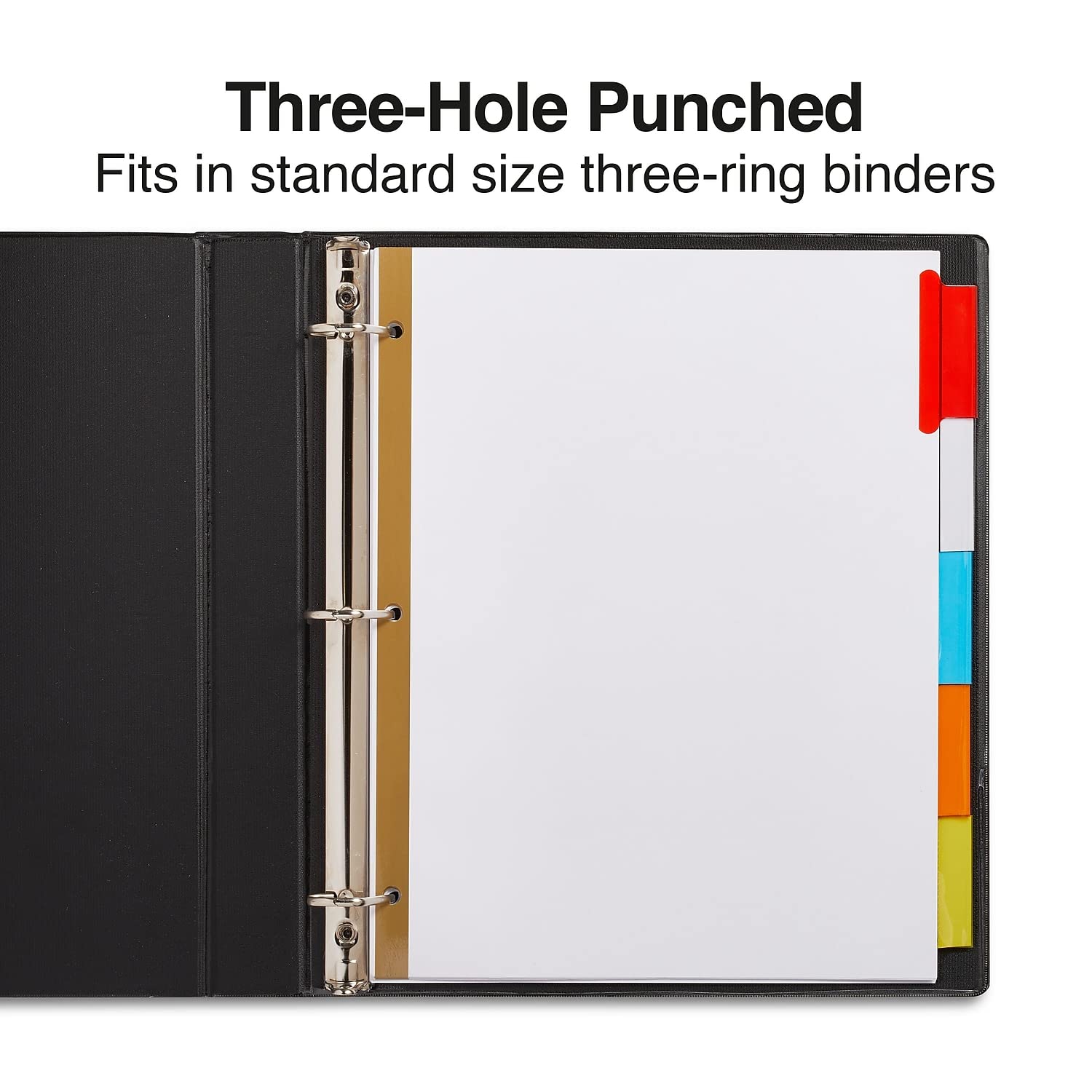 - Tab dividers let you organize projects, personal documents, and more. Made of white paper with multicolor tabs. Three-hole punched and ready for use. Five tabs per set.