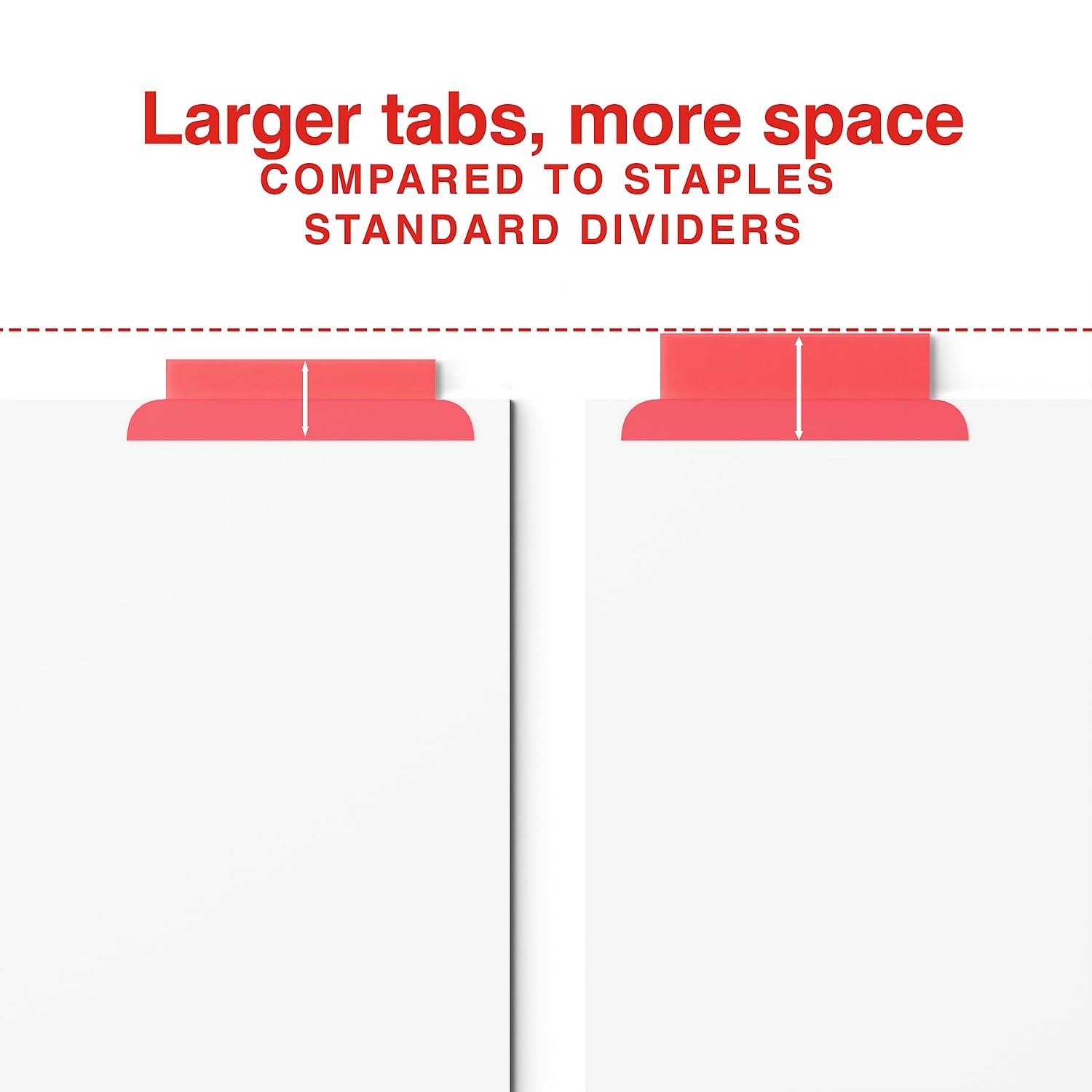 Make documents easier to browse with this set of Staples multicolor Big Tab five-tab paper dividers. Browse documents efficiently with this set of multicolor five-tab paper dividers. Each tab has a unique color, so you can identify individual sections at a glance, while the white paper construction offers a clean appearance and durability. This set of Staples five-tab paper dividers lets you insert and remove your own custom tabs, so you can personalize and reuse them. Tab dividers let you organize projects, personal documents, and more. Made of white paper with multicolor tabs. Three-hole punched and ready for use. Five tabs per set.